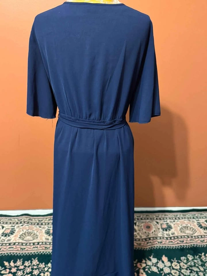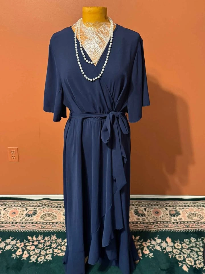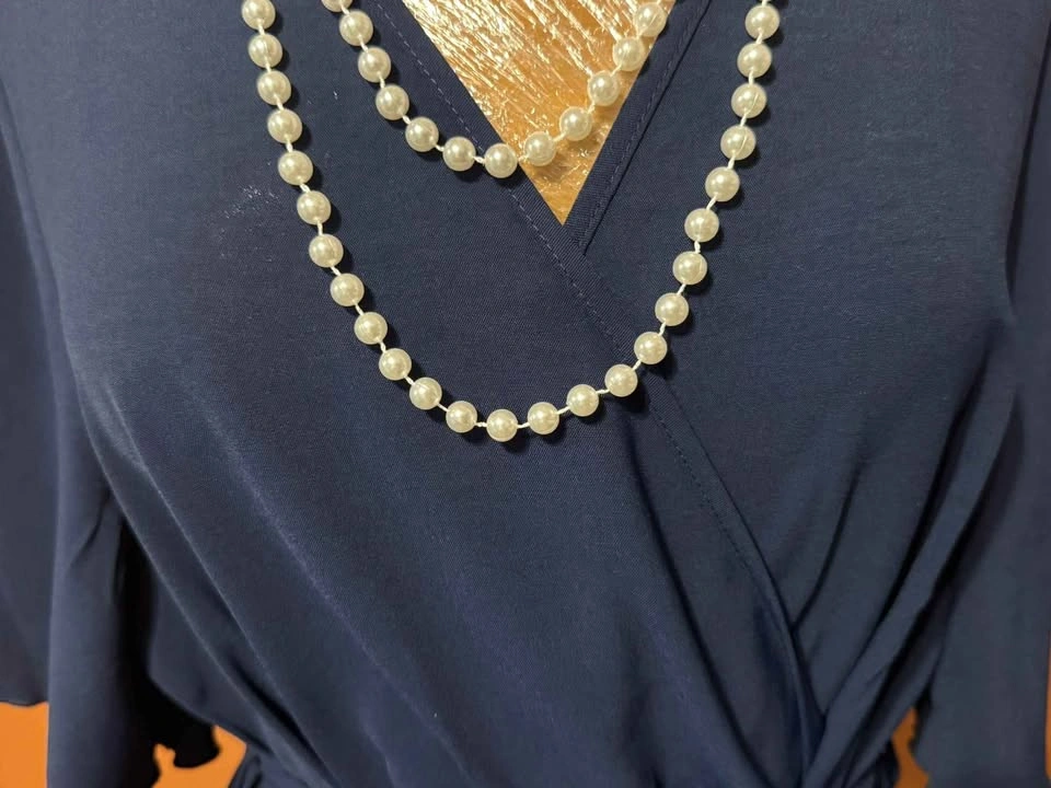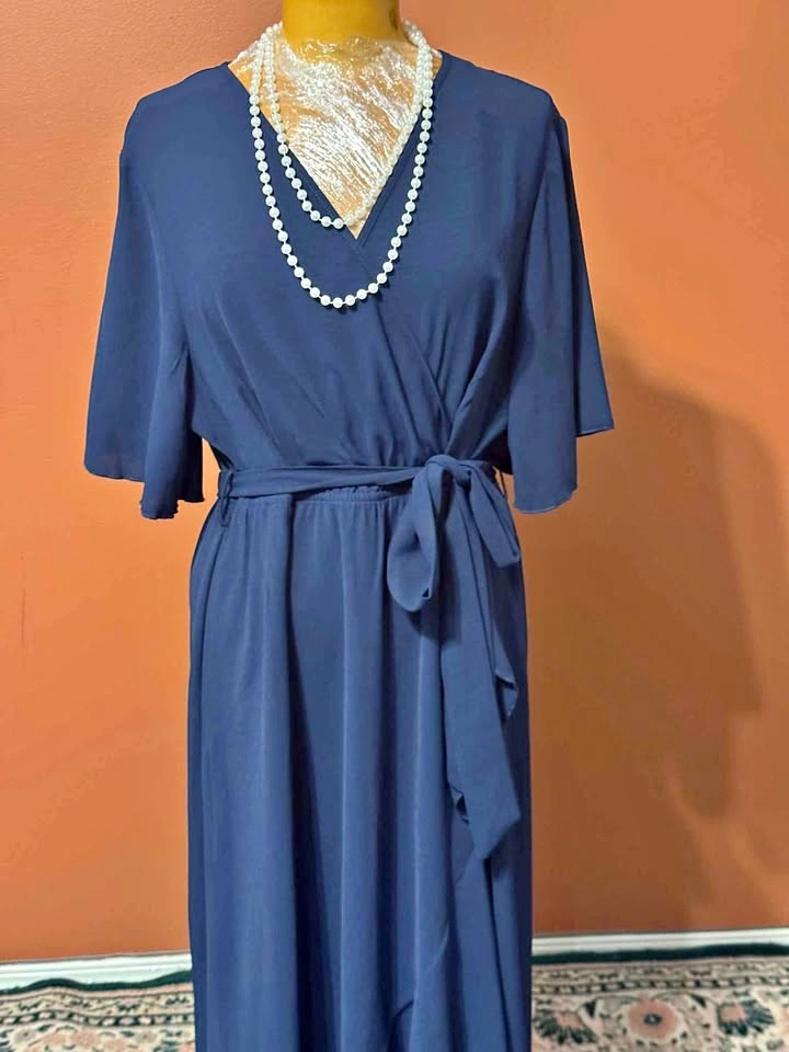 Elevate your everyday or occasion look with this Scomchic wrap-style midi dress in deep navy. The soft, drapey fabric cinches perfectly at the waist with a matching tie belt and features flutter sleeves for a flattering, feminine finish. ✨ Brand New with Tags ✨ Size L – true to size ✨ Wrap-style with waist tie ✨ Flowy flutter sleeves ✨ Falls below the knee ✨ Optional layered pearl necklace just $5 extra 📍 Pickup near Centennial Park, Mission 📦 Bundle deals available – message for more dresses and accessories!