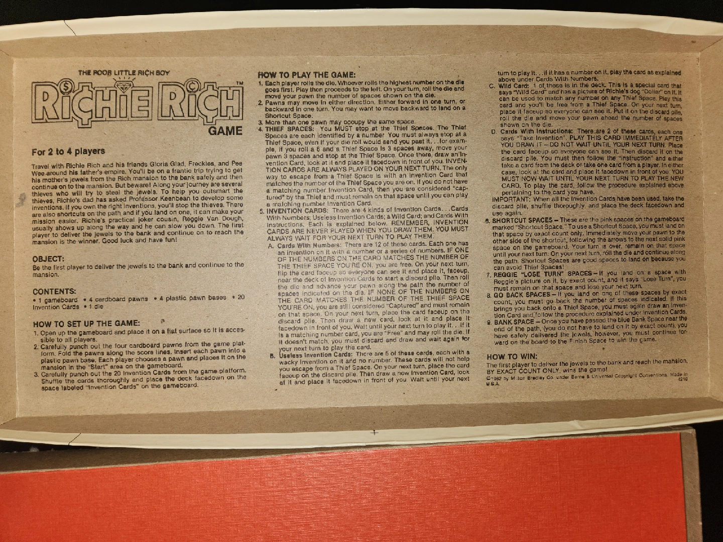 Game is complete and easy to play! Experience the nostalgia of the 1982 Milton Bradley Company's Richie Rich Wacky Inventions Board Game. This vintage game is perfect for 2 or more players. The game's multicolor design will brighten up your game nights and keep you entertained for hours. This classic board game is a must-have for any game collector or fan of Richie Rich. $15 Cash only. Pickup only. CHECK OUT MY OTHER ADS!!!