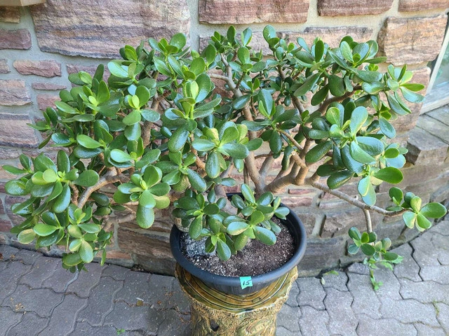 Large healthy jade plant almost 2 feet tall from its base and 3 feet across leaf to leaf. A very well-cared for plant that's been in with the family for many, many years. Many more jade and other plants available!
