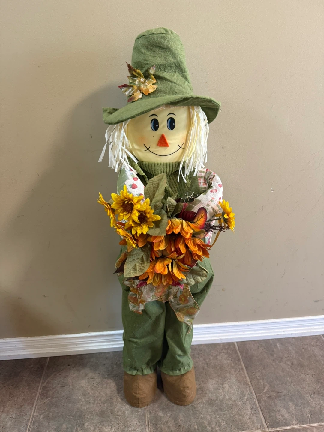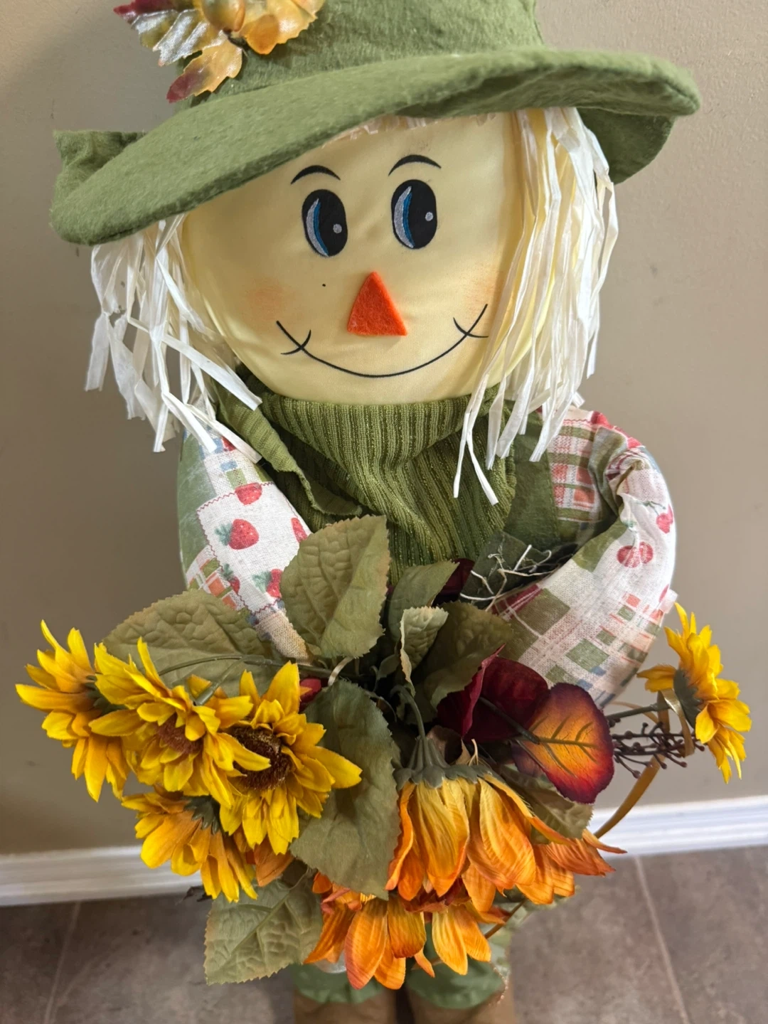 A cute scarecrow decoration perfect for fall! It's holding a bouquet of sunflowers and has a green hat and outfit. This would look great on a porch or inside your home for the autumn season - fall related item - π§‘