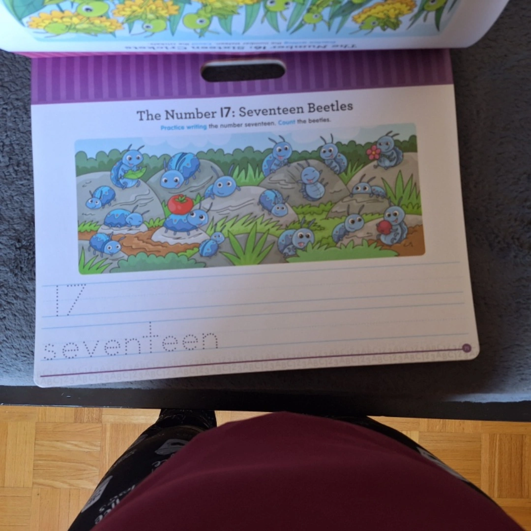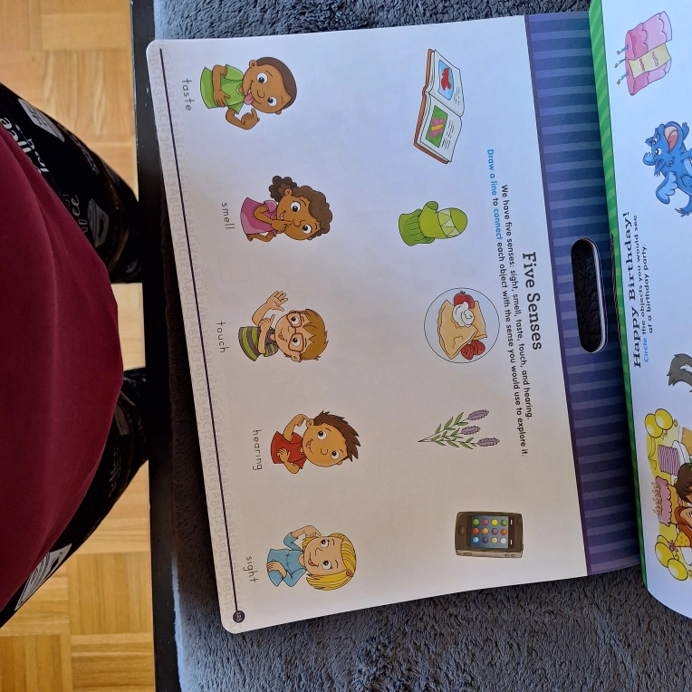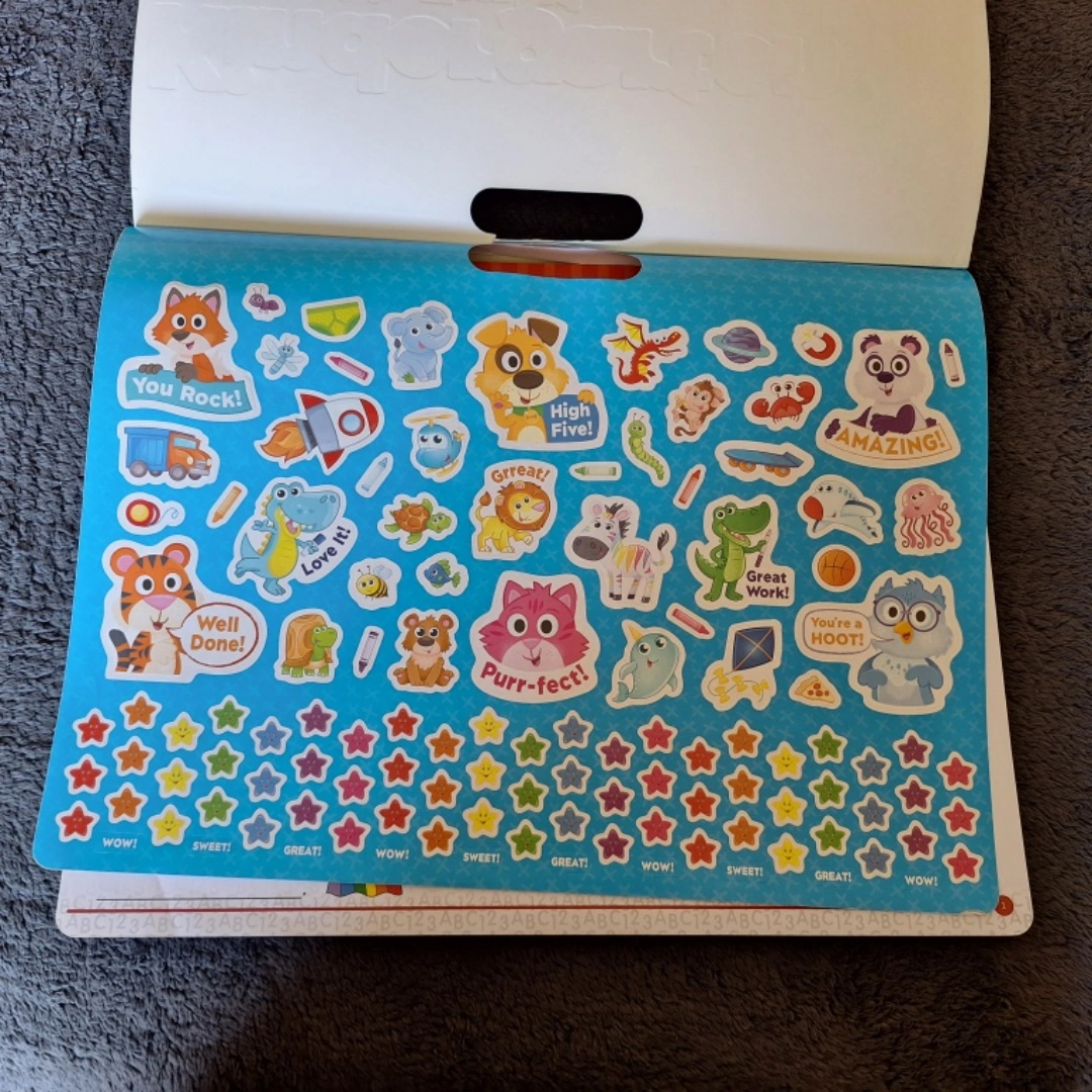 Super Smart Kindergarten Giant Activity Floor Pad for ages 5-6. Includes 100+ stickers and 128 colour pages. Covers 8 subjects: reading, writing, science, creativity, math, music, nature, and social skills. Some pages used but still tons left.