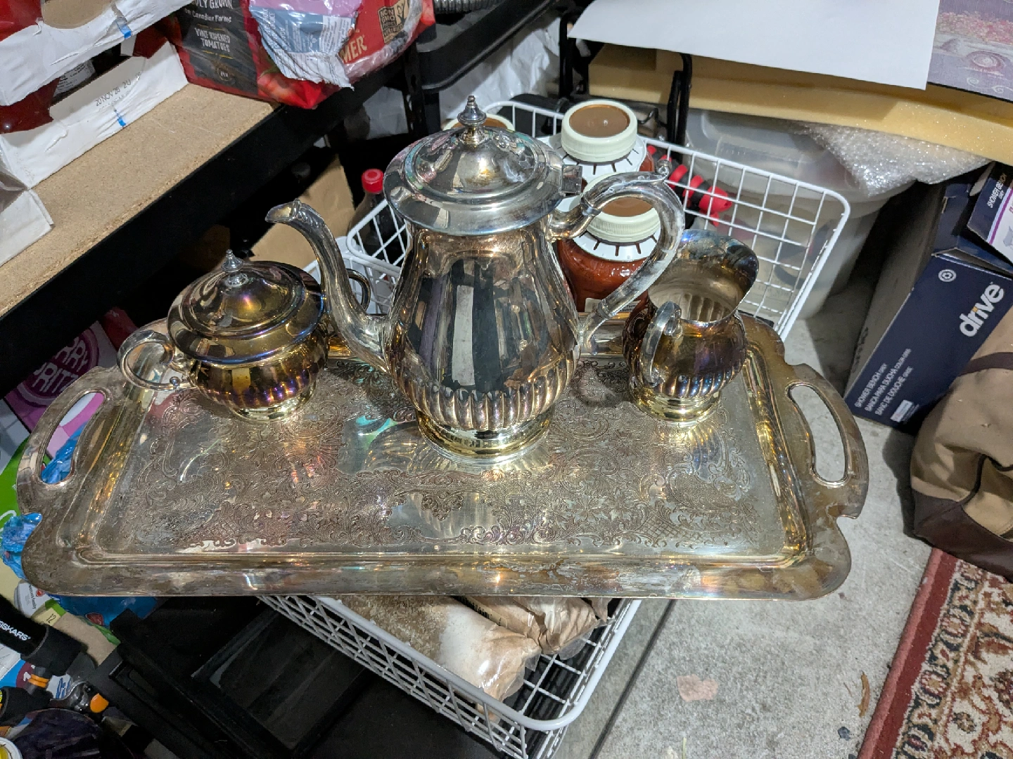 Selling a vintage silver plated tea set. It includes a teapot, sugar bowl, creamer, and a serving tray. The set has a beautiful, ornate design. Perfect for adding a touch of elegance to your tea time