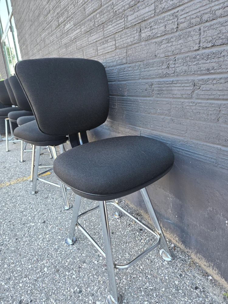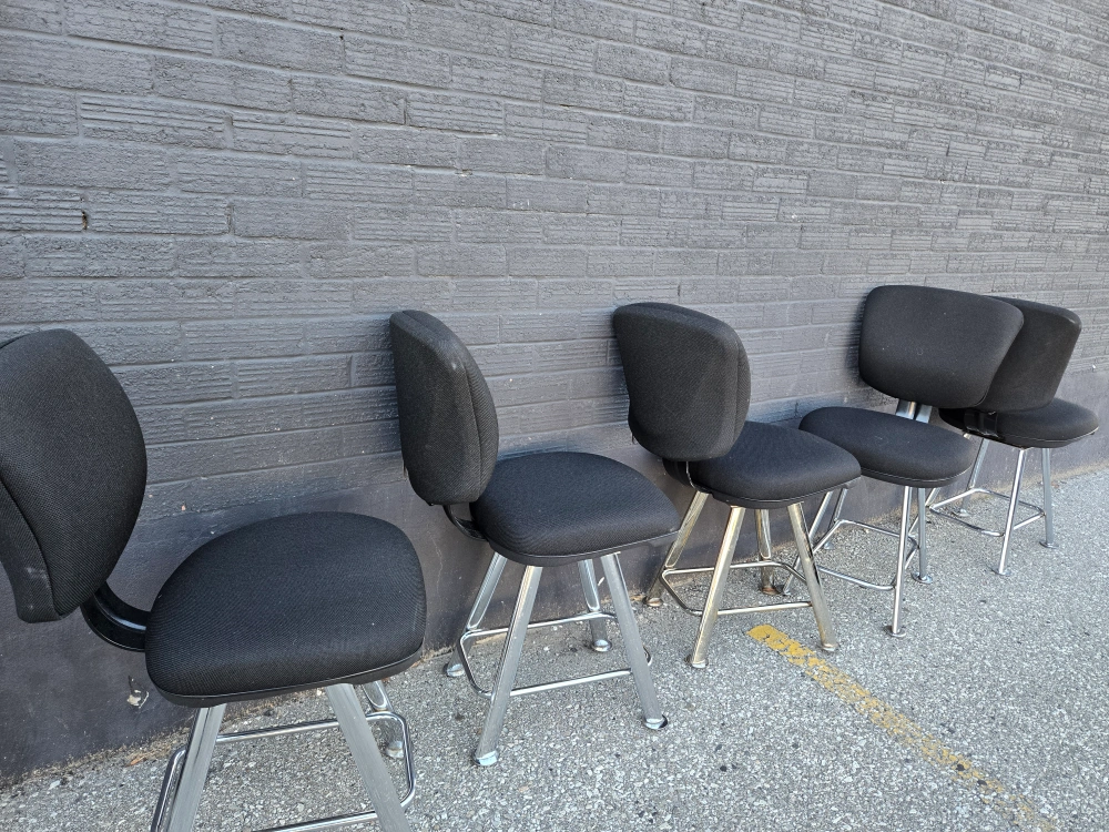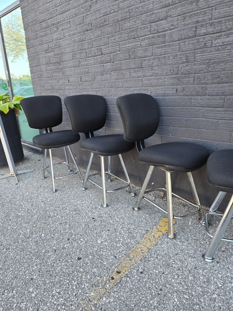 Selling a set of five bar stools. They're in great shape and would look great in a kitchen or bar area. The stools have a black seat and back with chrome legs. They are sturdy and comfortable. These are highly durable, very comfortable casino slot, machine chairs..