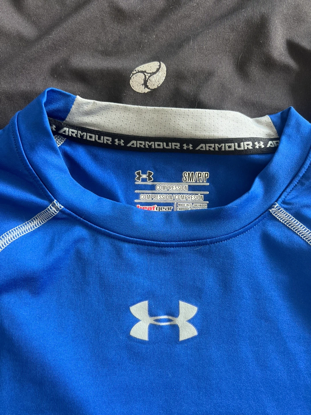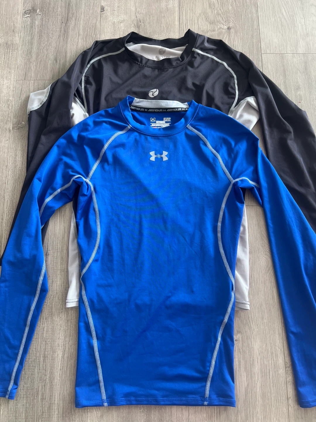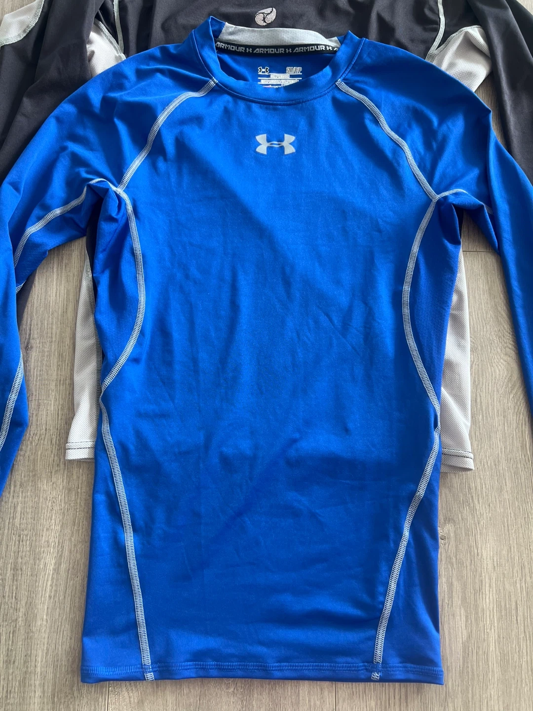 Under Armour compression heat gear shirt size small for sale! One is blue and the other is black and grey firststar size M.