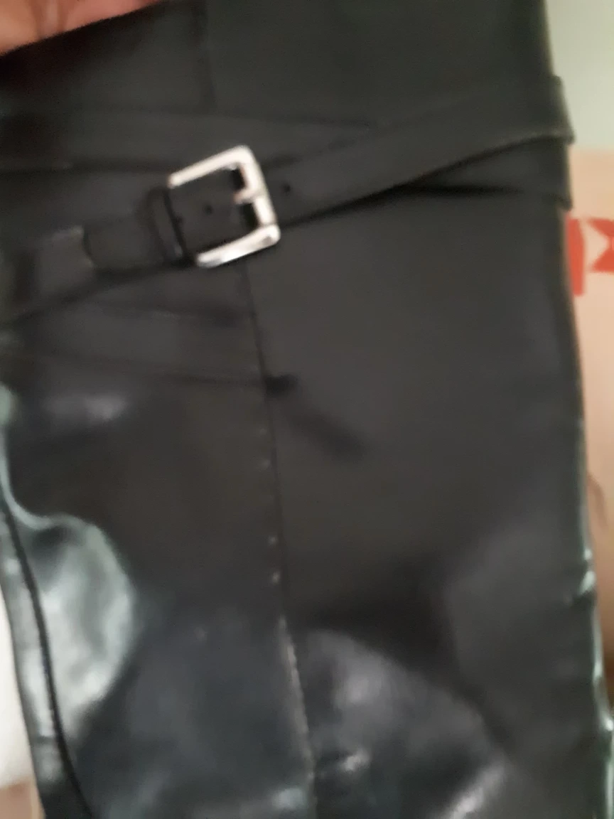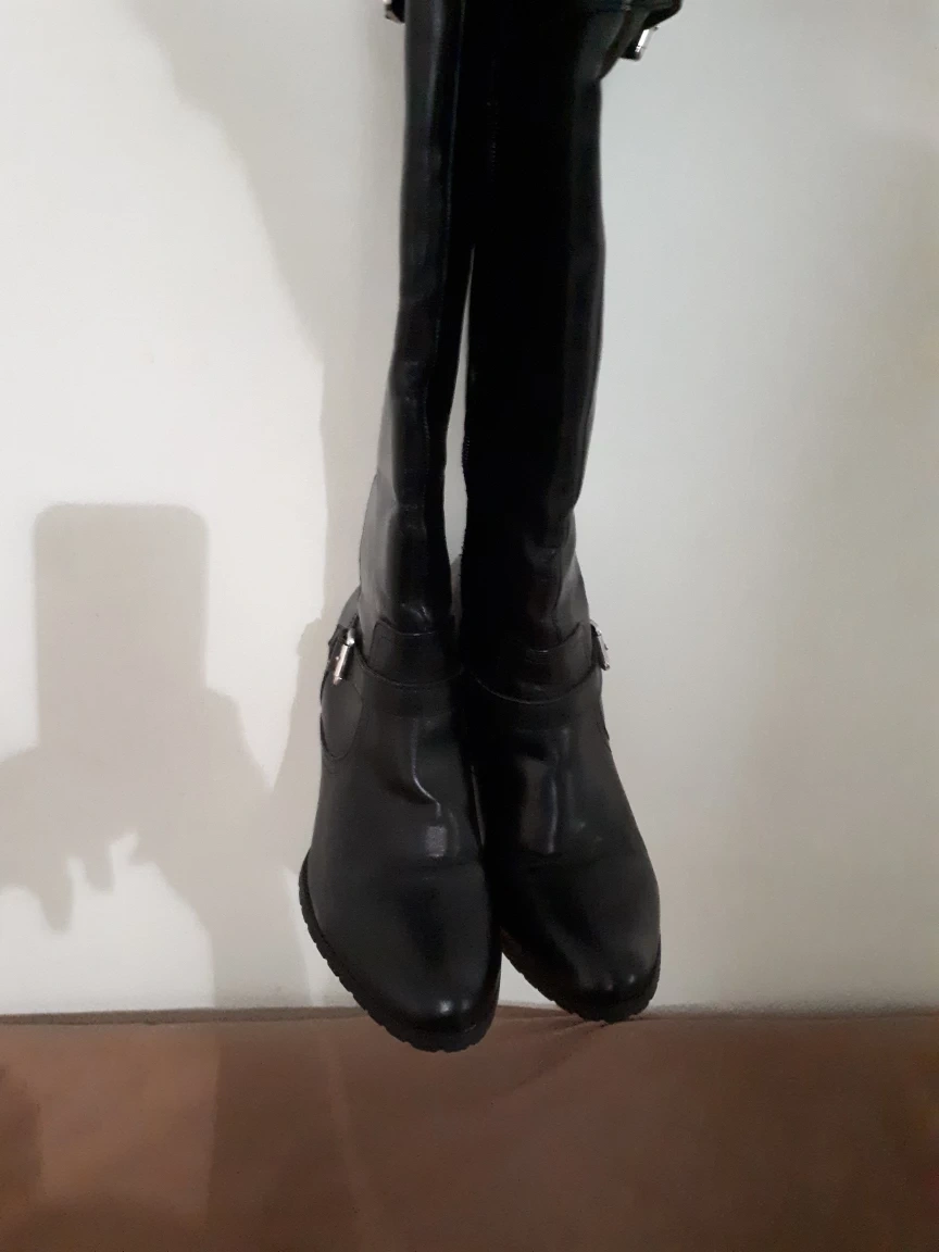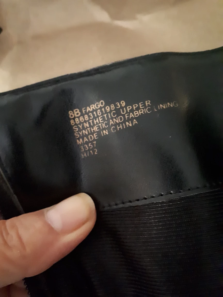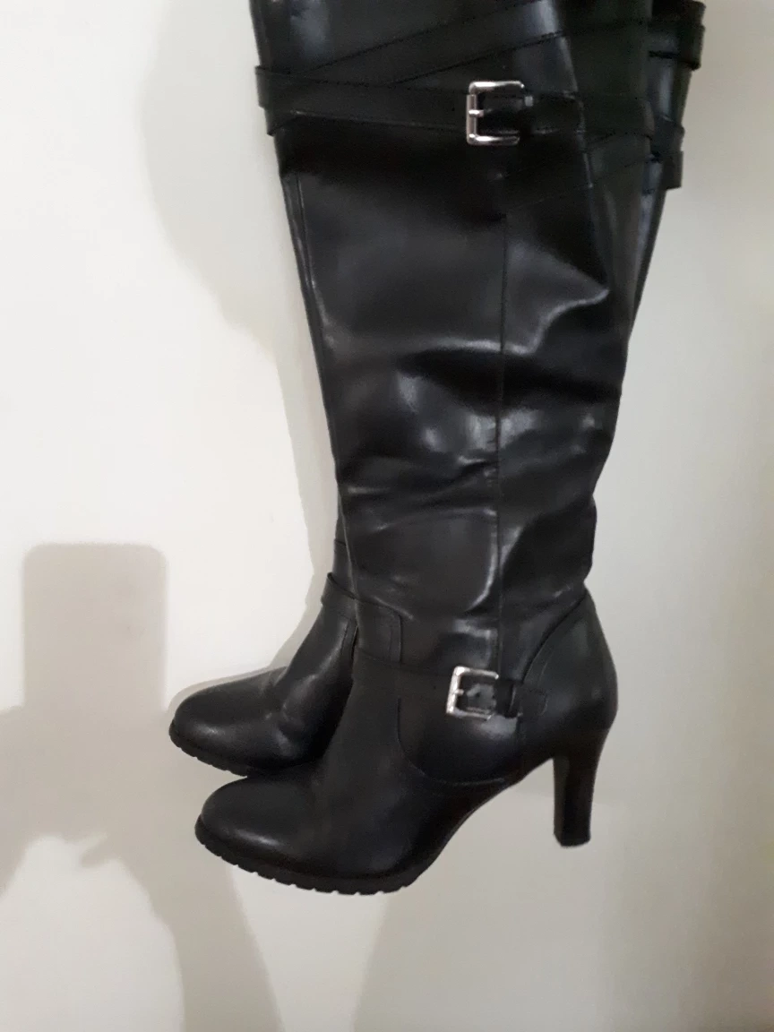 Selling a pair of Fargo black leather boots in size 8B. They feature a stylish buckle detail and are made with a synthetic upper and fabric lining. These boots are perfect for adding a touch of elegance to any outfit!