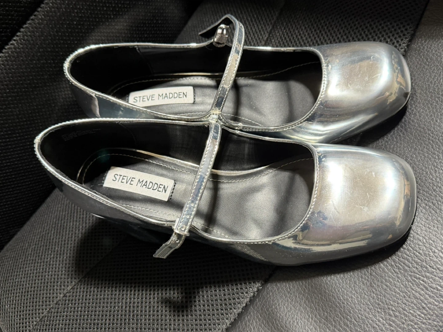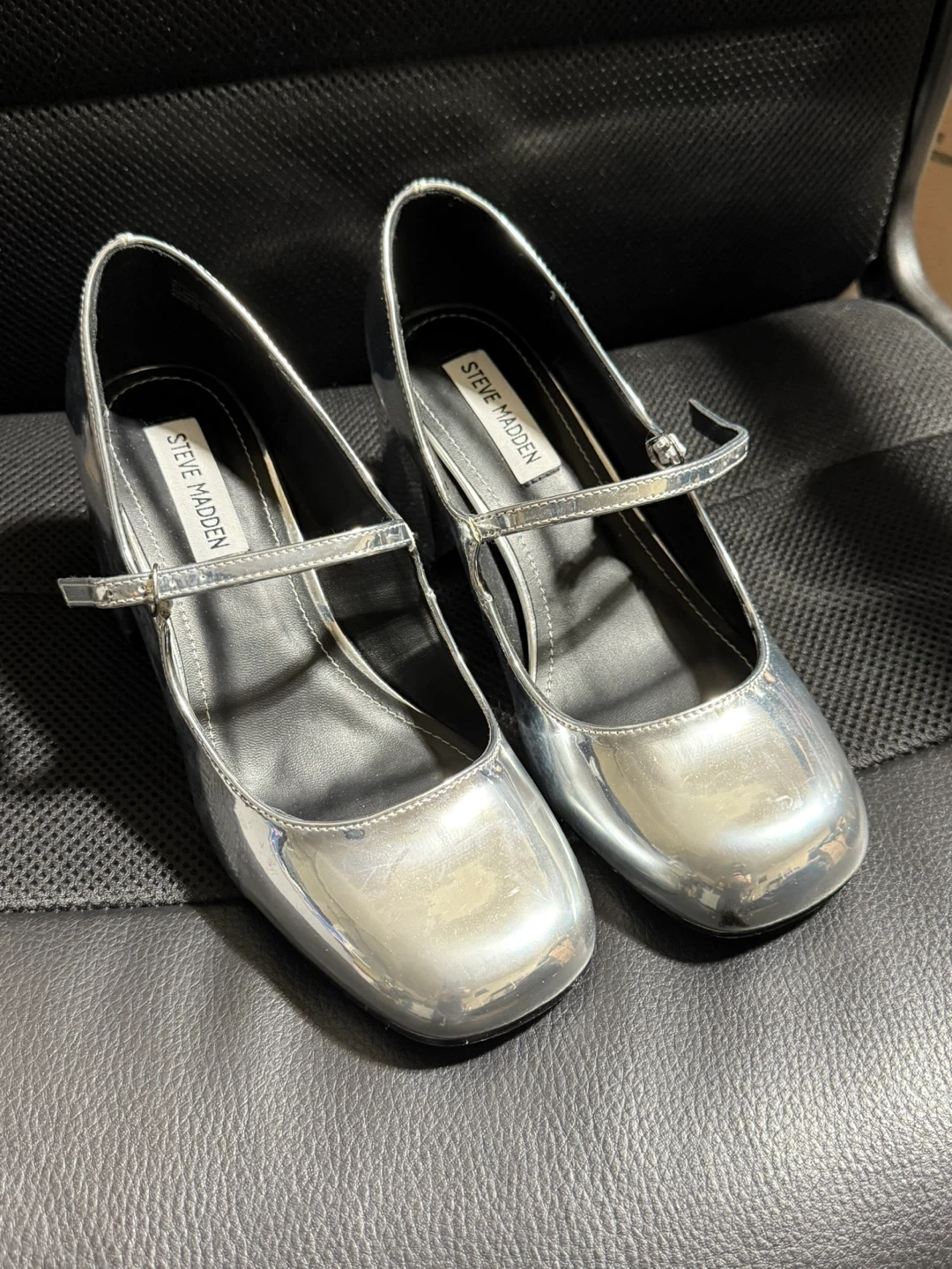 A pair of stylish brand new Steve Madden Mary Jane shoes in a shiny silver colour! They're in great shape and are a women's size 8. Perfect for adding a bit of flair to any outfit! Fit for going to work and going for a party.