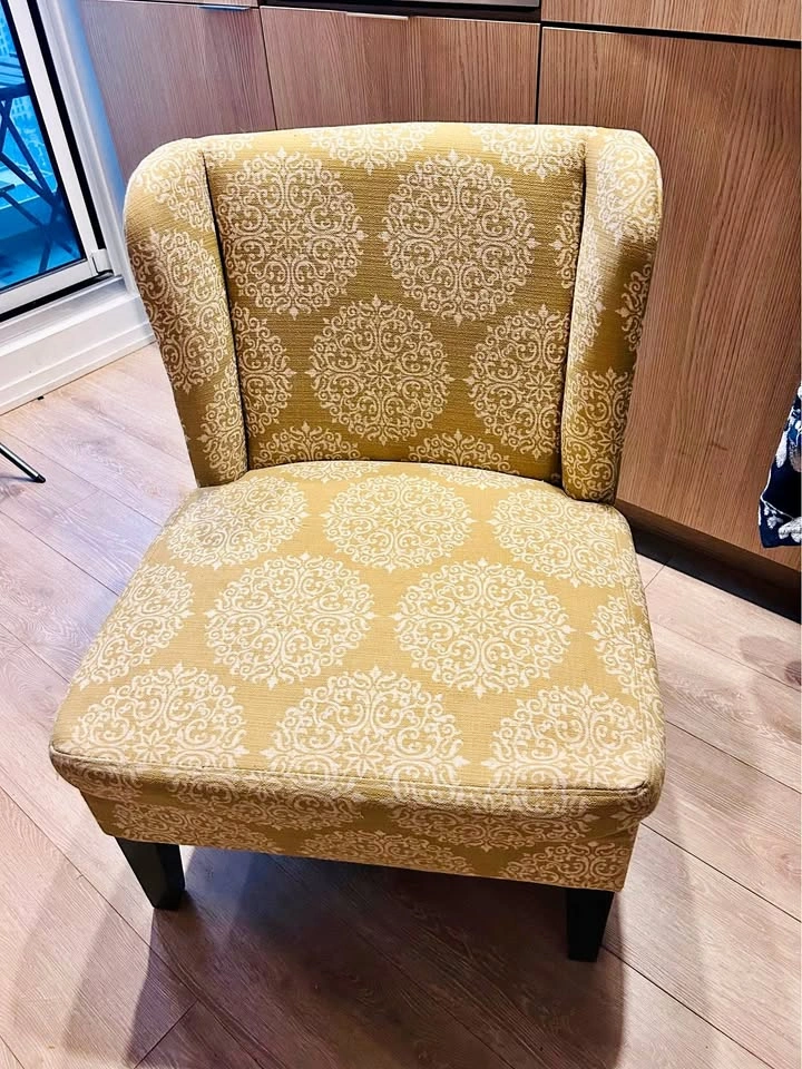 Stylish accent chair. Features a light shuttle green fabric with an off-white damask pattern. Dark brown legs. Perfect for adding a touch of elegance to any room. Can be mix matched with any colour table and sofas Pick up bay and temperance