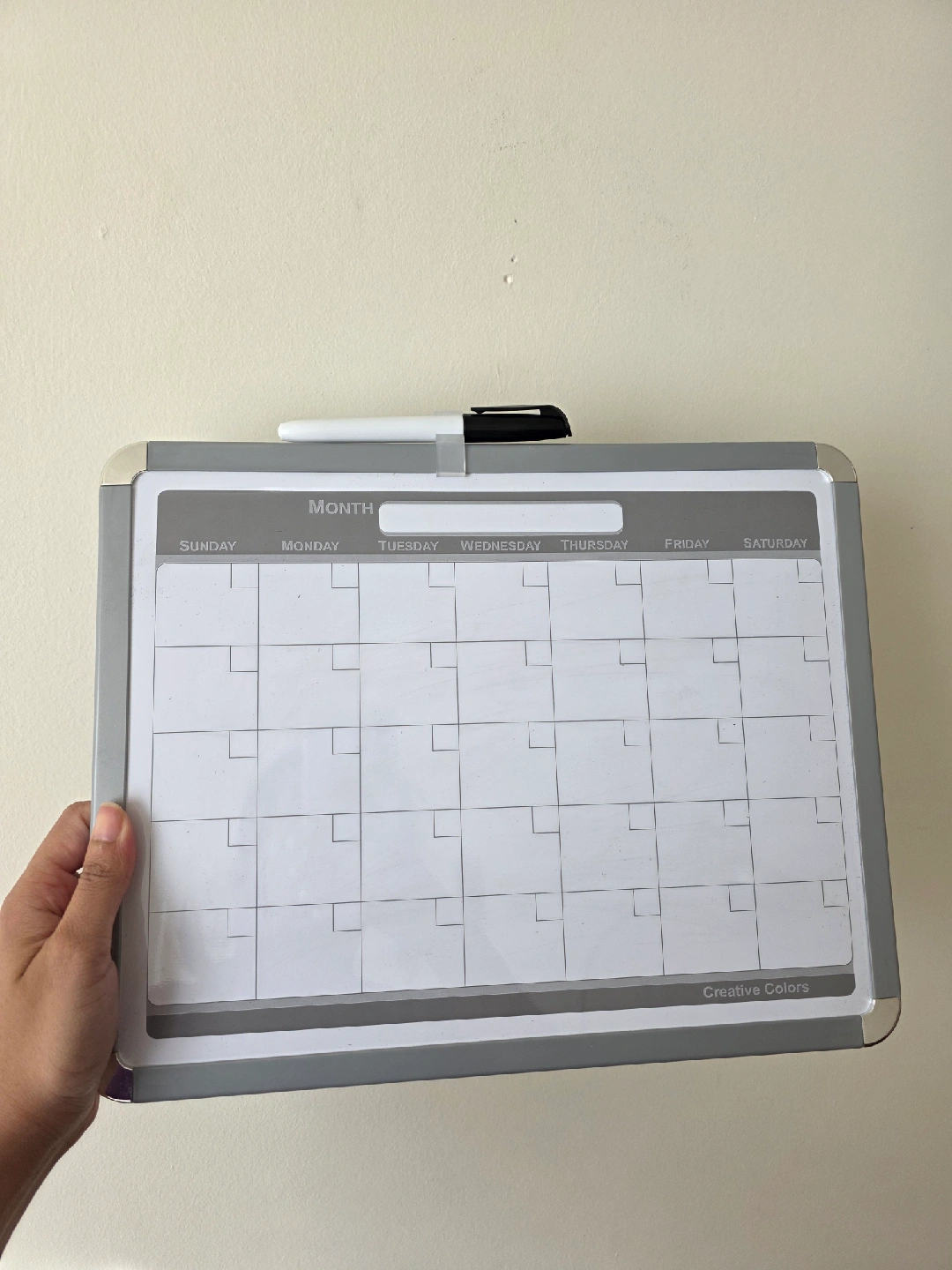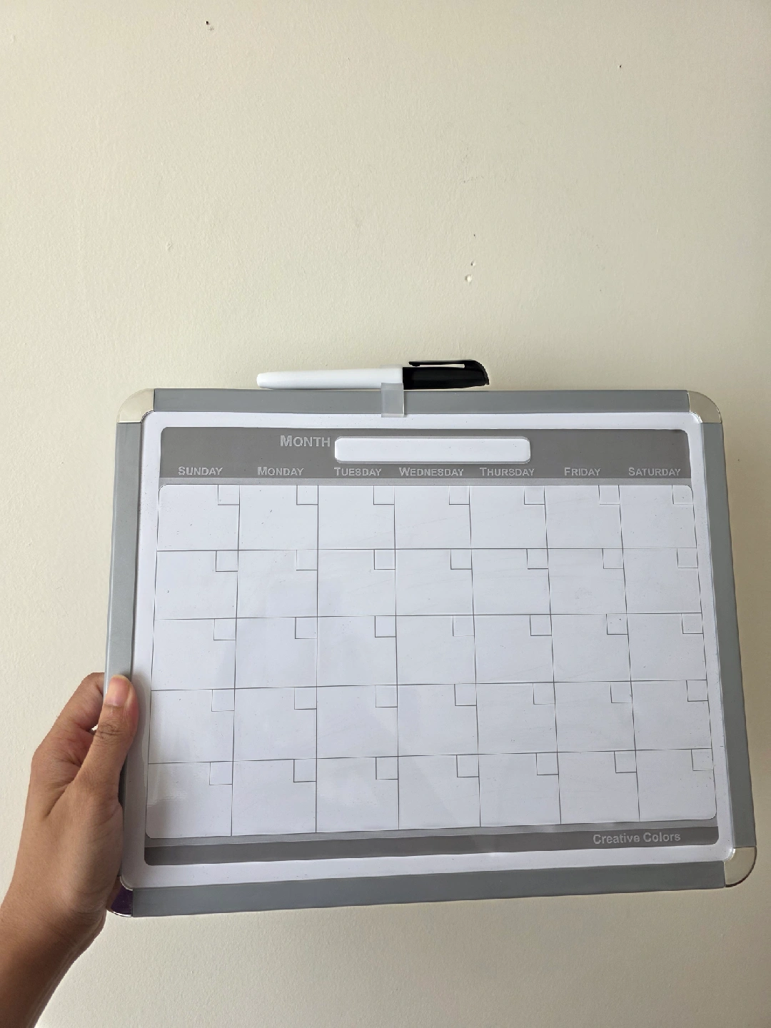 Whiteboard monthly planner. It comes with a marker, a magnet, some wall mount tape, and an eraser. Perfect for keeping track of your schedule! Like new condition. Used a few times but not needed any more.