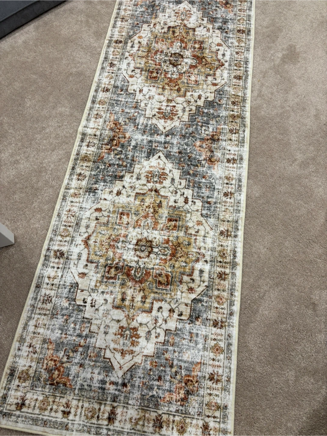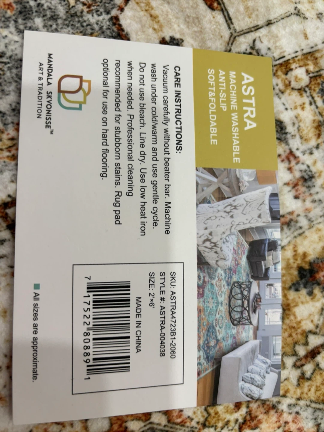Selling a beautiful Astra Mandala Skyonisse rug! It's machine washable and in great condition. The size is 2' x 6'. Perfect for adding a touch of style to any room!