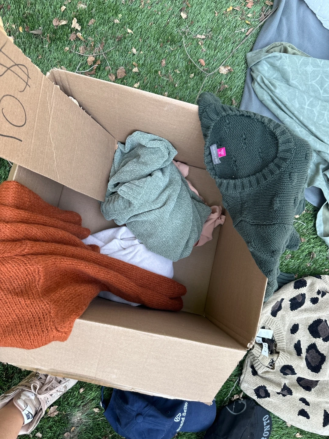 Selling a box of assorted clothing items . There are sweaters, shirts, and other pieces in various colours and styles. Great for someone looking to add some variety to their wardrobe!