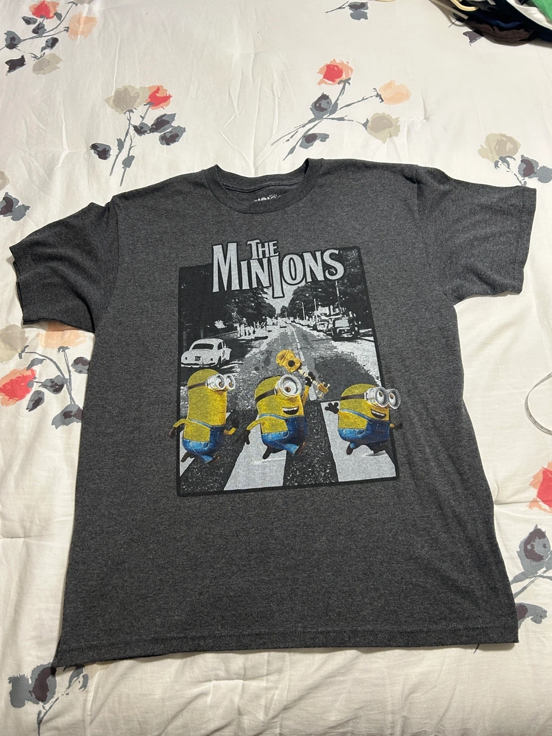 Selling a Minions t-shirt in size large! The shirt features the Minions crossing Abbey Road. The fabric is a blend of cotton and polyester, so it's super comfy. Center measures approximately 21” Length measures approximately 29” Smoke Free/Pet Free home Check my other listings for more clothing items!