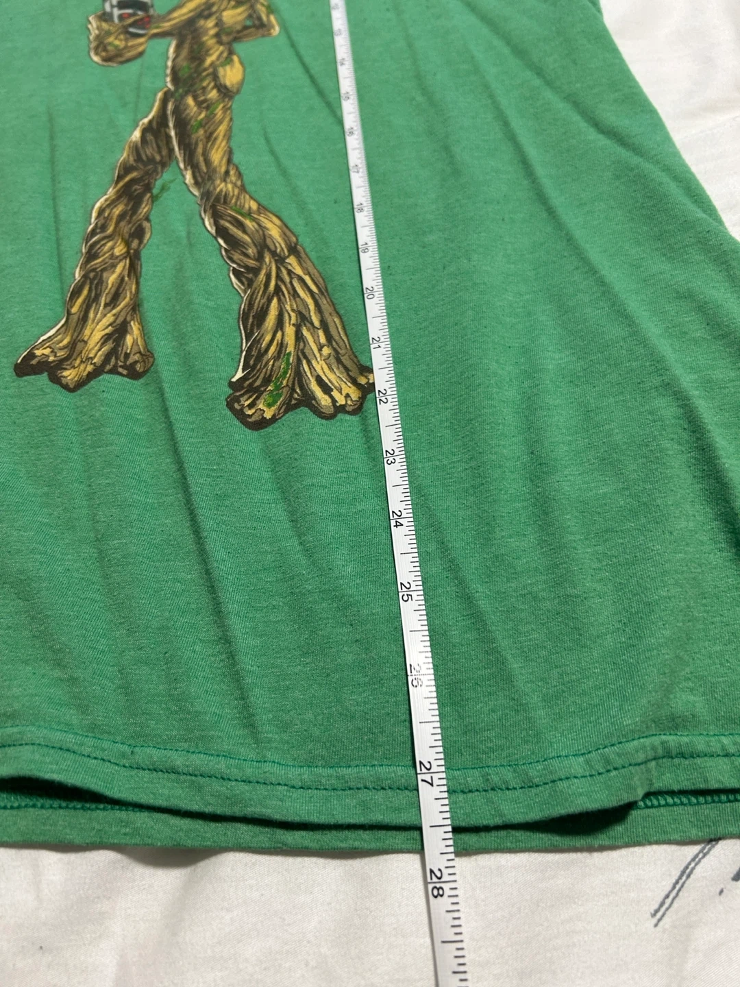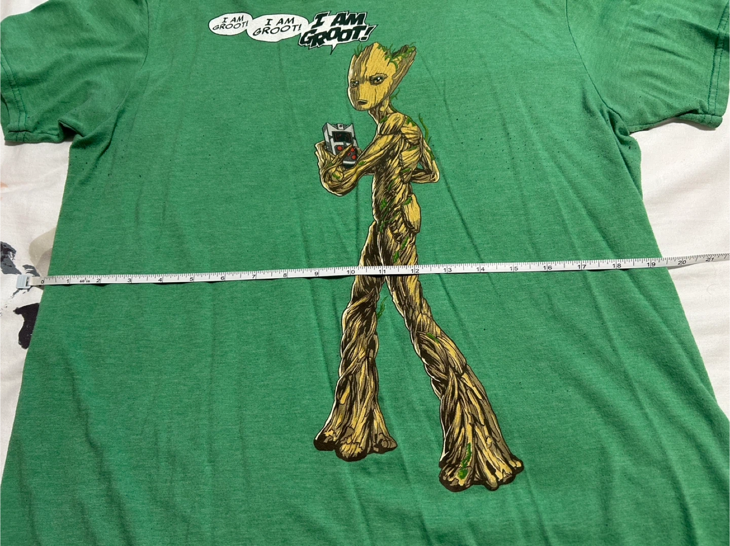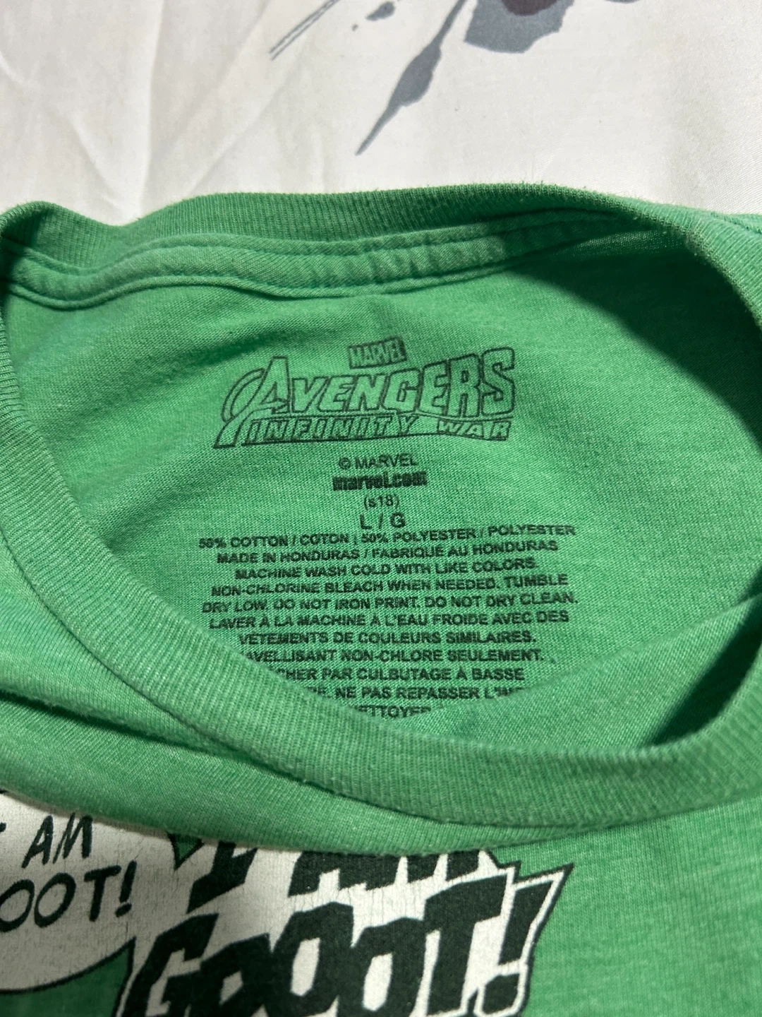 Selling a green Marvel Avengers Infinity War t-shirt featuring Groot! It's a size large and made of 50% cotton and 50% polyester Center measures 19.5” across Length measures 27.5” Smoke Free/Pet Free home Check my other listings for more clothing items!