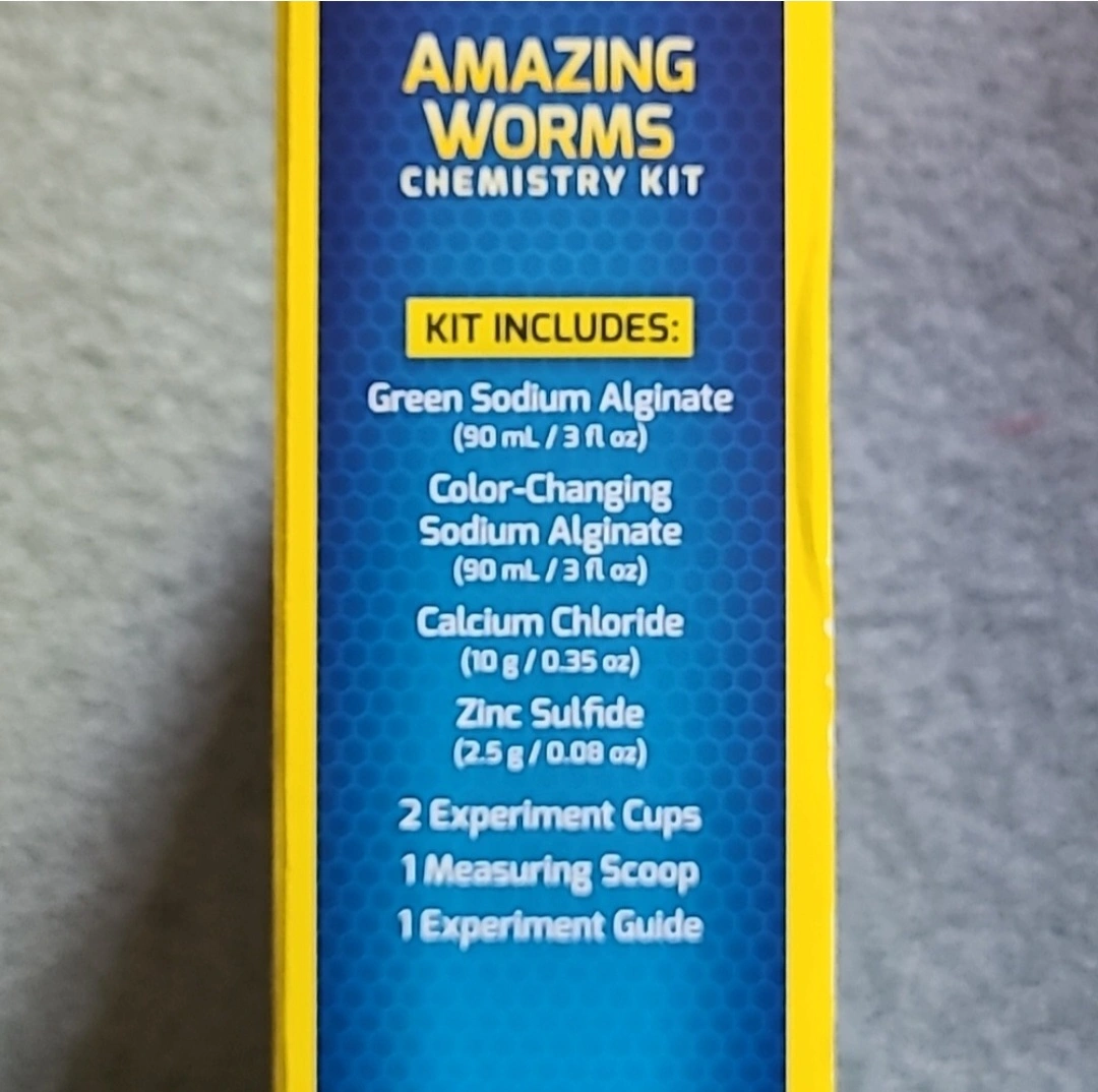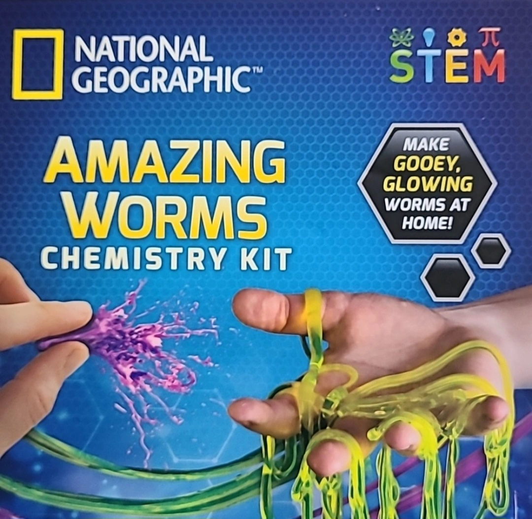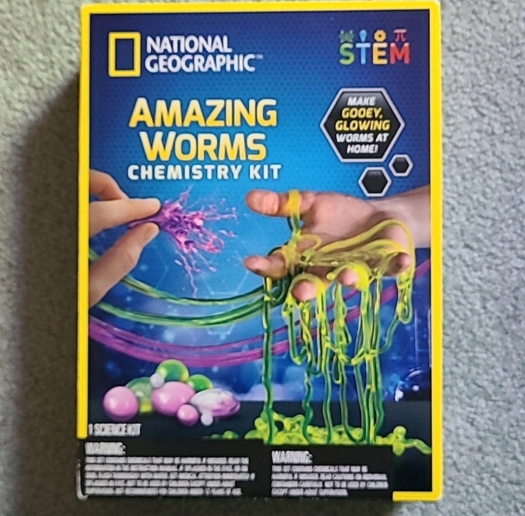 I'm selling a National Geographic Amazing Worms Chemistry Kit. It's a STEM kit to make gooey, glowing worms at home! The kit includes: - Green Sodium Alginate (90 mL / 3 fl oz) - Color-Changing Sodium Alginate (90 mL / 3 fl oz) - Calcium Chloride (10 g / 0.35 oz) - Zinc Sulfide (2.5 g / 0.08 oz) - 2 Experiment Cups - 1 Measuring Scoop - 1 Experiment Guide