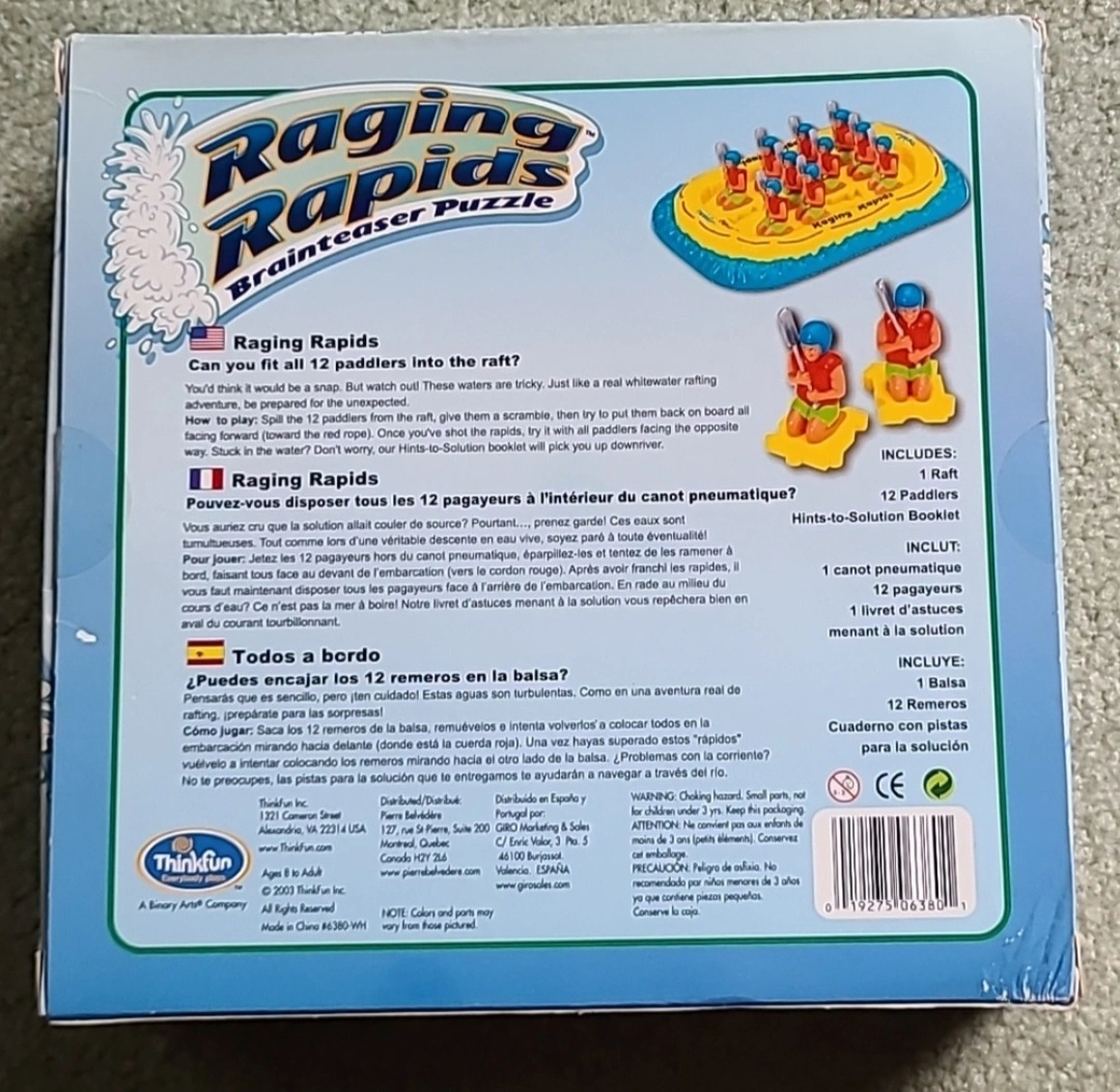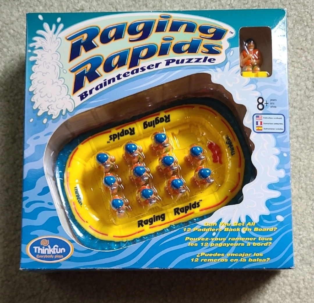 Get ready for some brain-teasing fun with the Thinkfun Raging Rapids puzzle! This game is perfect for ages 8 and up and includes: - 1 raft - 12 paddlers - Hints-to-Solution booklet Can you fit all 12 paddlers into the raft? It's trickier than it looks!