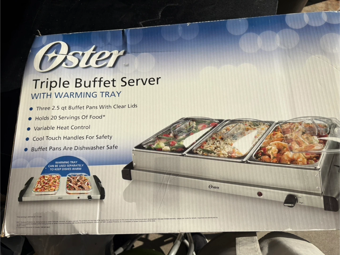 Keep your dishes warm with this Oster Triple Buffet Server! It comes with a warming tray and three 2.5 qt buffet pans with clear lids. It can hold 20 servings of food and features variable heat control and cool touch handles for safety. The buffet pans are dishwasher safe too