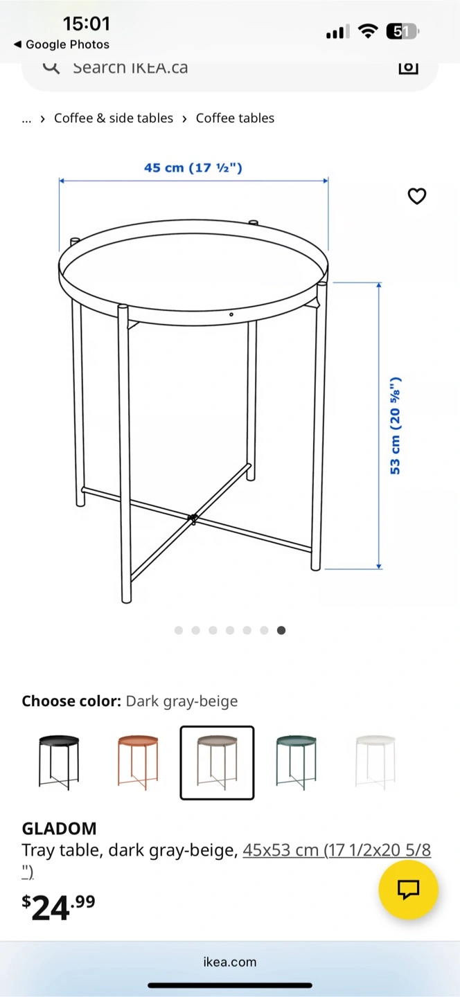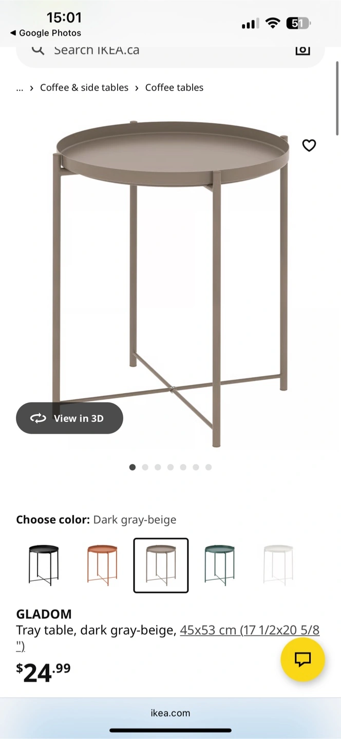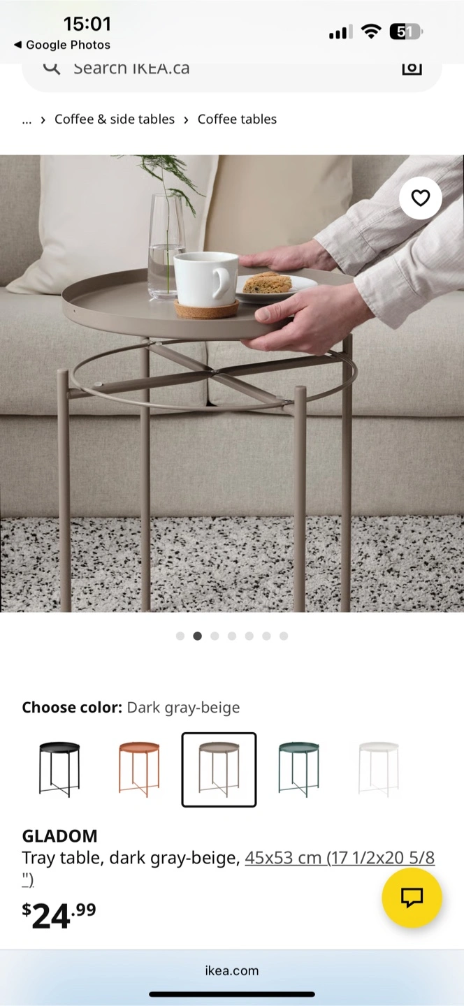Buy one for $20 - Buy two for $30 Selling a GLADOM tray table from IKEA in dark gray-beige! It's a great little table for beside a chair or as a coffee table. The dimensions are 45x53 cm (17 1/2x20 5/8 ")