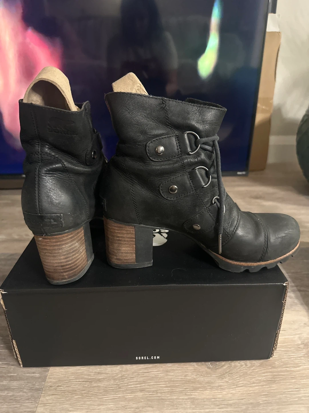 Selling a pair of Sorel Cate Lace Boots in black, size 8. They're in good condition and ready for a new home. These stylish boots feature a lace-up design with a block heel, perfect for adding a touch of edge to any outfit. The box is included!
