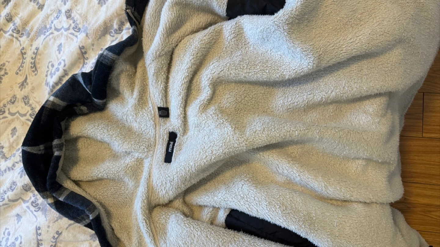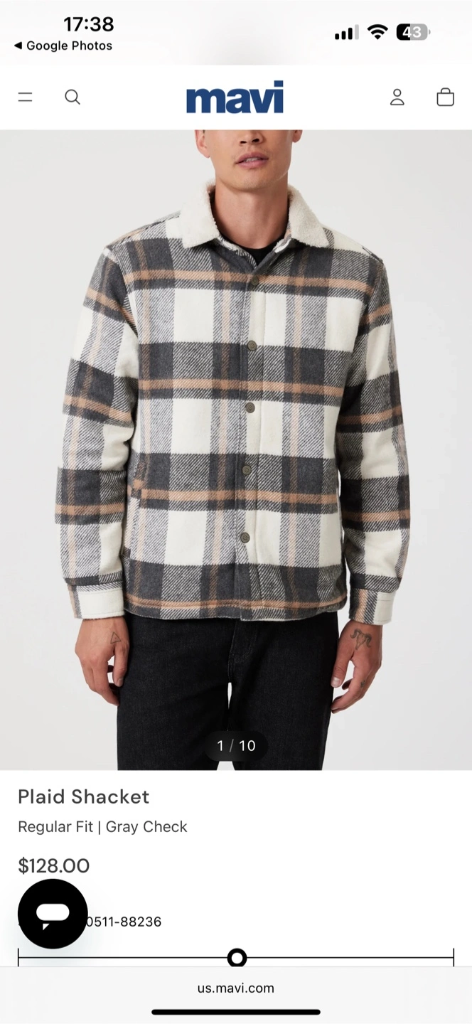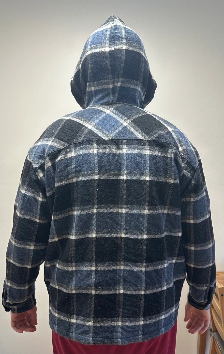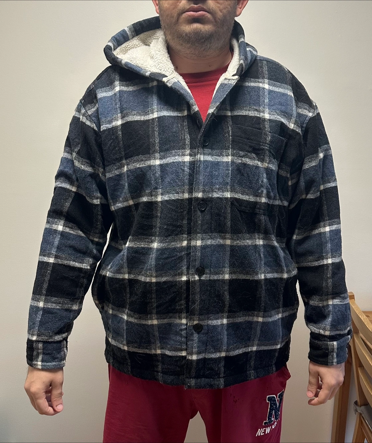 Cozy up in this Mavi plaid shacket! It's an XXL and features a warm, sherpa-like lining. The outer material is a stylish plaid pattern in shades of blue, black, and white.