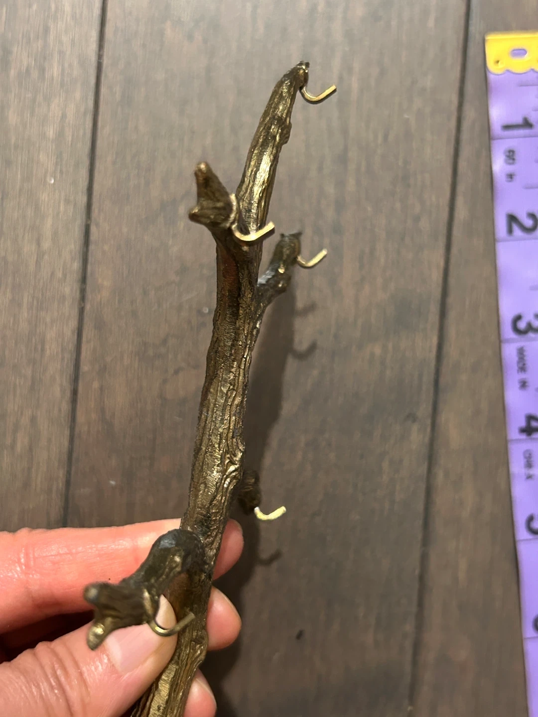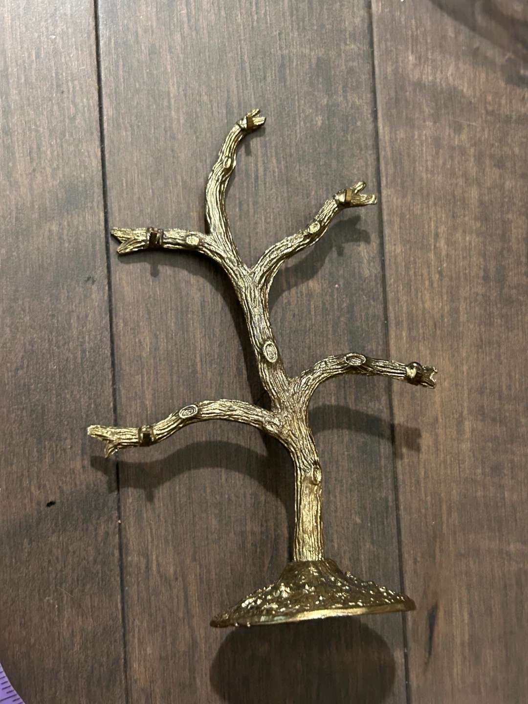Here's a jewelry tree stand in a gold colour! It measures approximately 7 inches in height. Great for displaying your necklaces, bracelets, and earrings