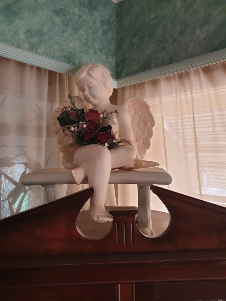 This is a used angel statue, perfect for adding a touch of serenity to any room, featuring intricate details and a peaceful expression. It is in good condition. This charming angel statue has some minor wear and tear, adding to its vintage appeal. Not for outside. This cherub angel statue is just waiting to find its forever home—could that be with you? Don't miss the chance to bring this unique piece into your life. And yes, if the ad is up, it's still available! No holds first PU.