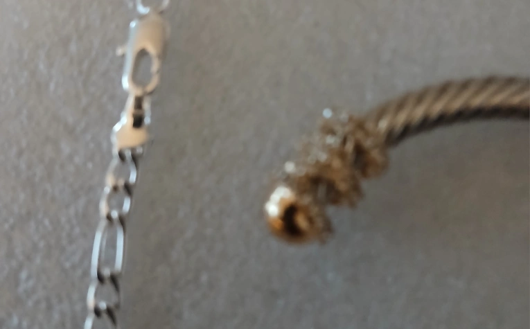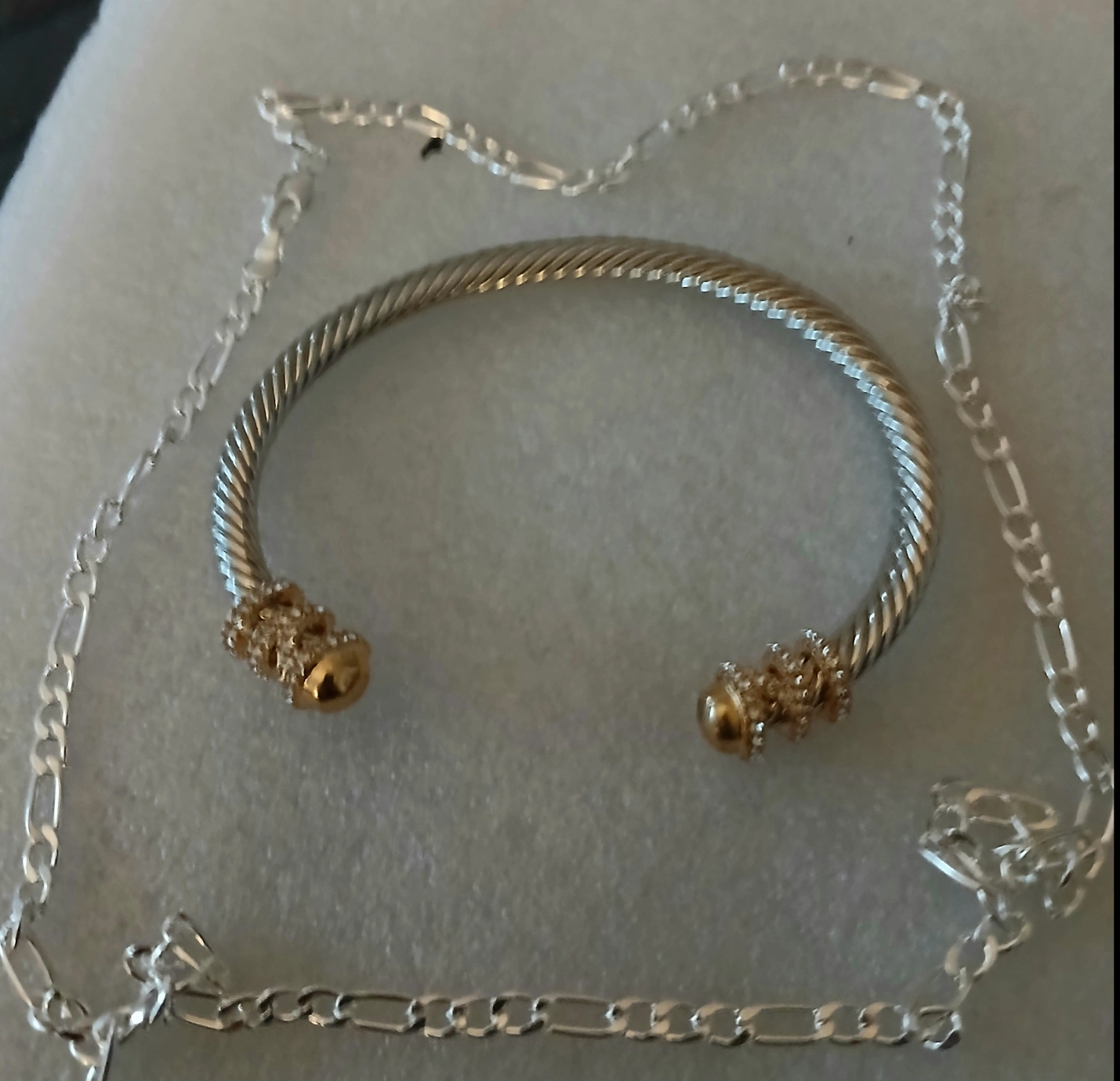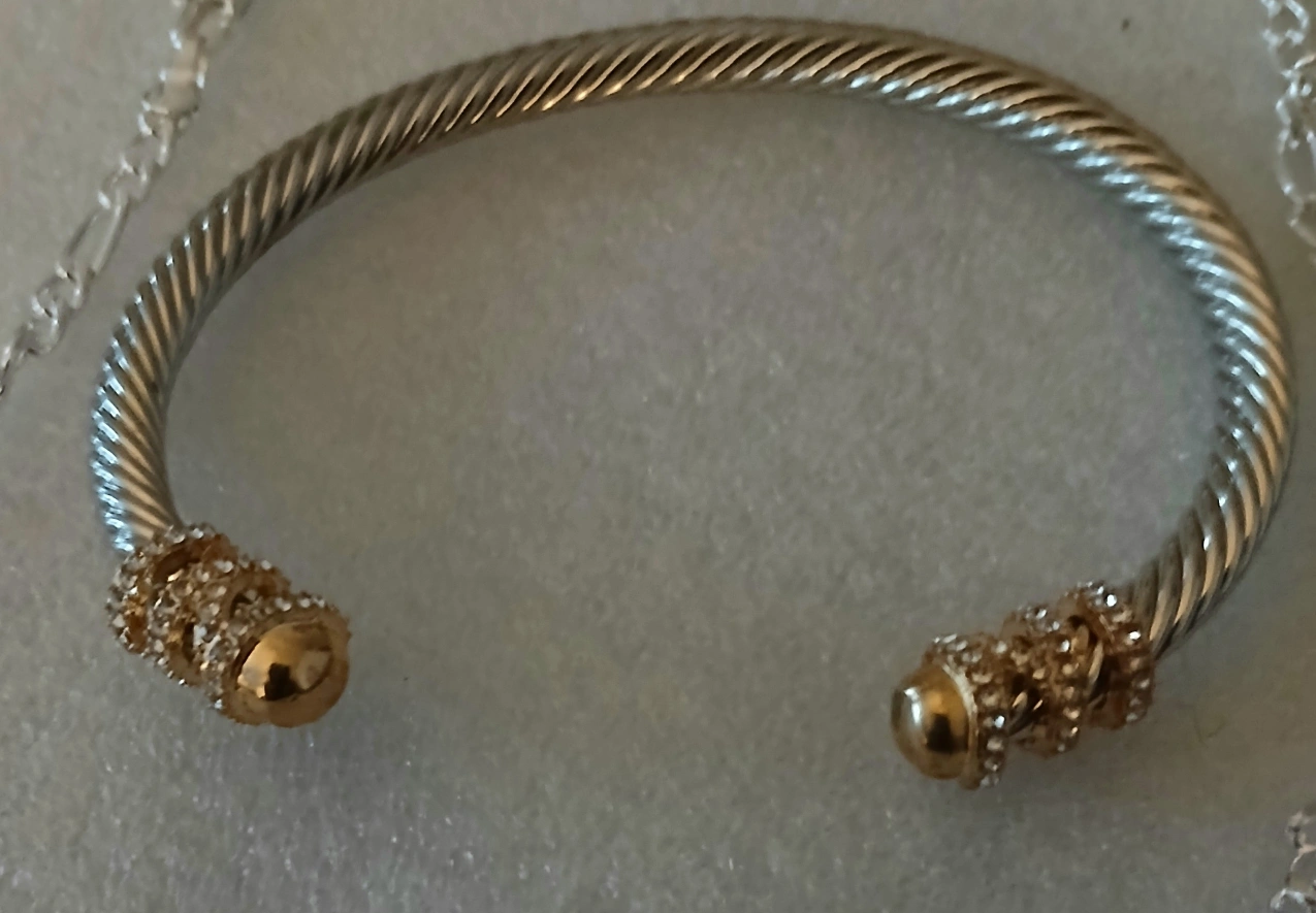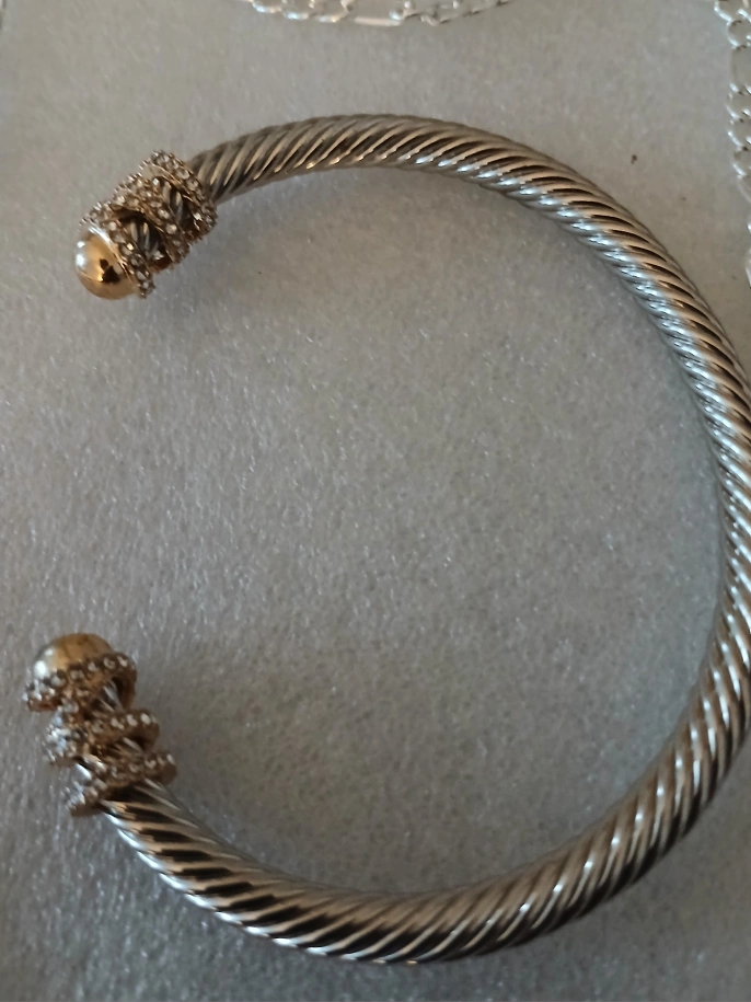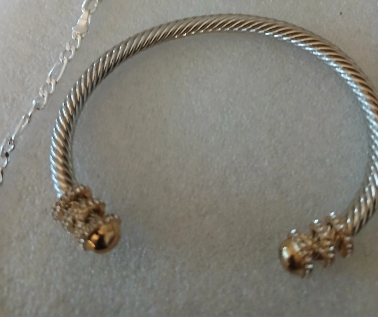 Selling a silver-tone cable bangle bracelet. It has a twisted cable design with decorative gold-tone accents on the ends. Comes with a silver tone chain. In great condition! bangle is adjustable