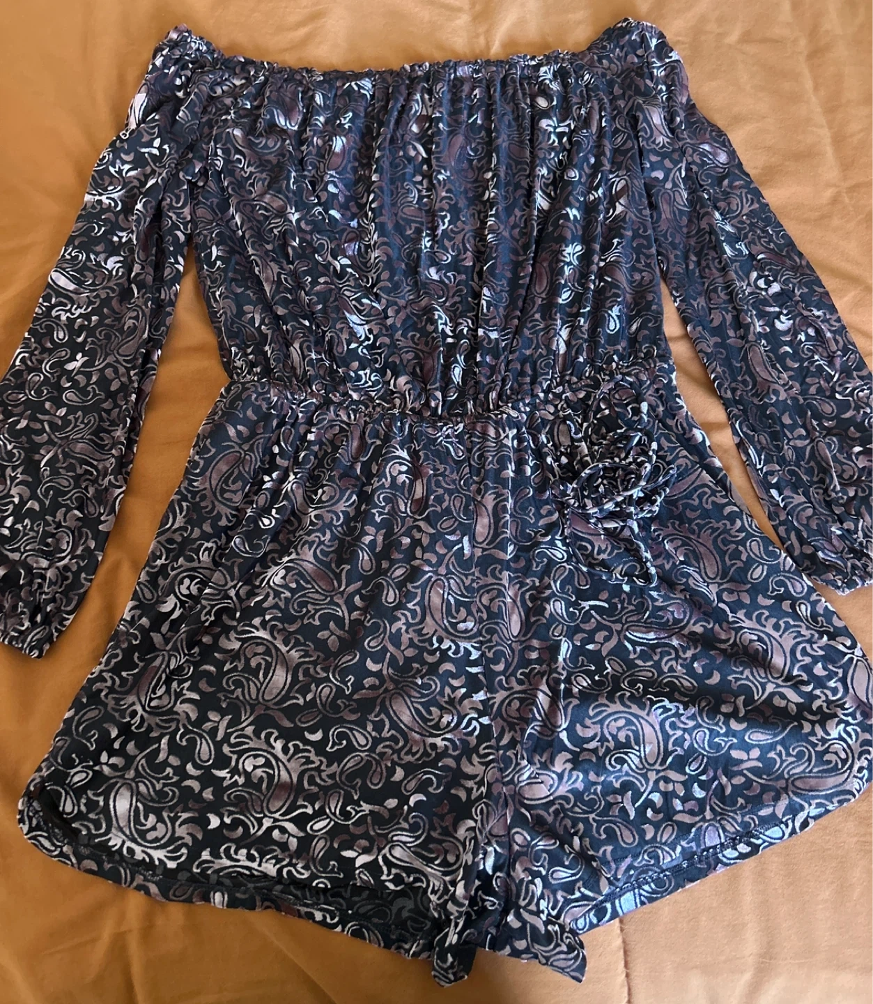 Here's a cute patterned romper! It features an off-the-shoulder design and long sleeves. It's super comfortable, has an elastic waist and is made of velvet.