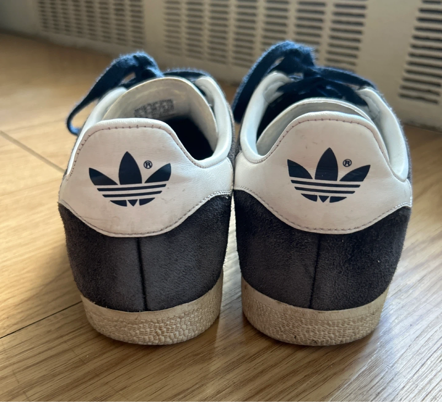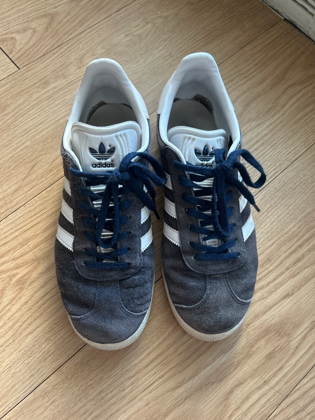 Selling a pair of Adidas Gazelle shoes in navy! The colouring is a little worn and are a size 5.5 (US). Selling because they are a little too small for me.