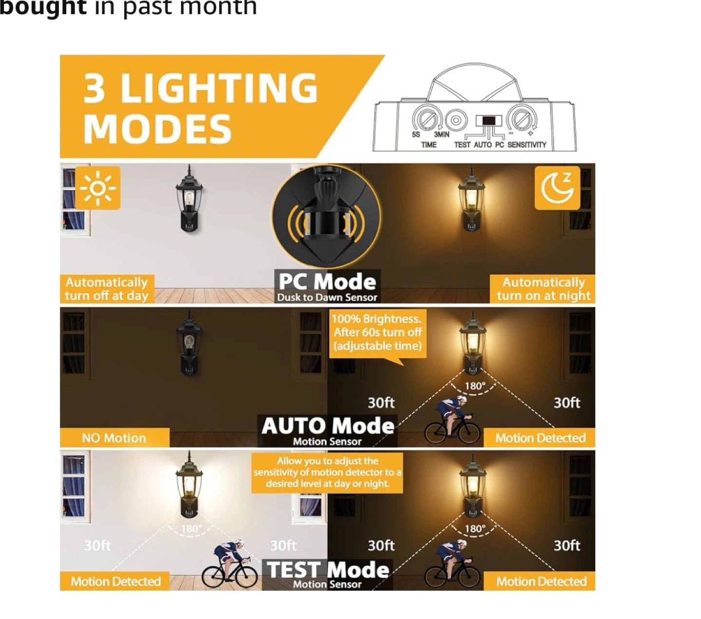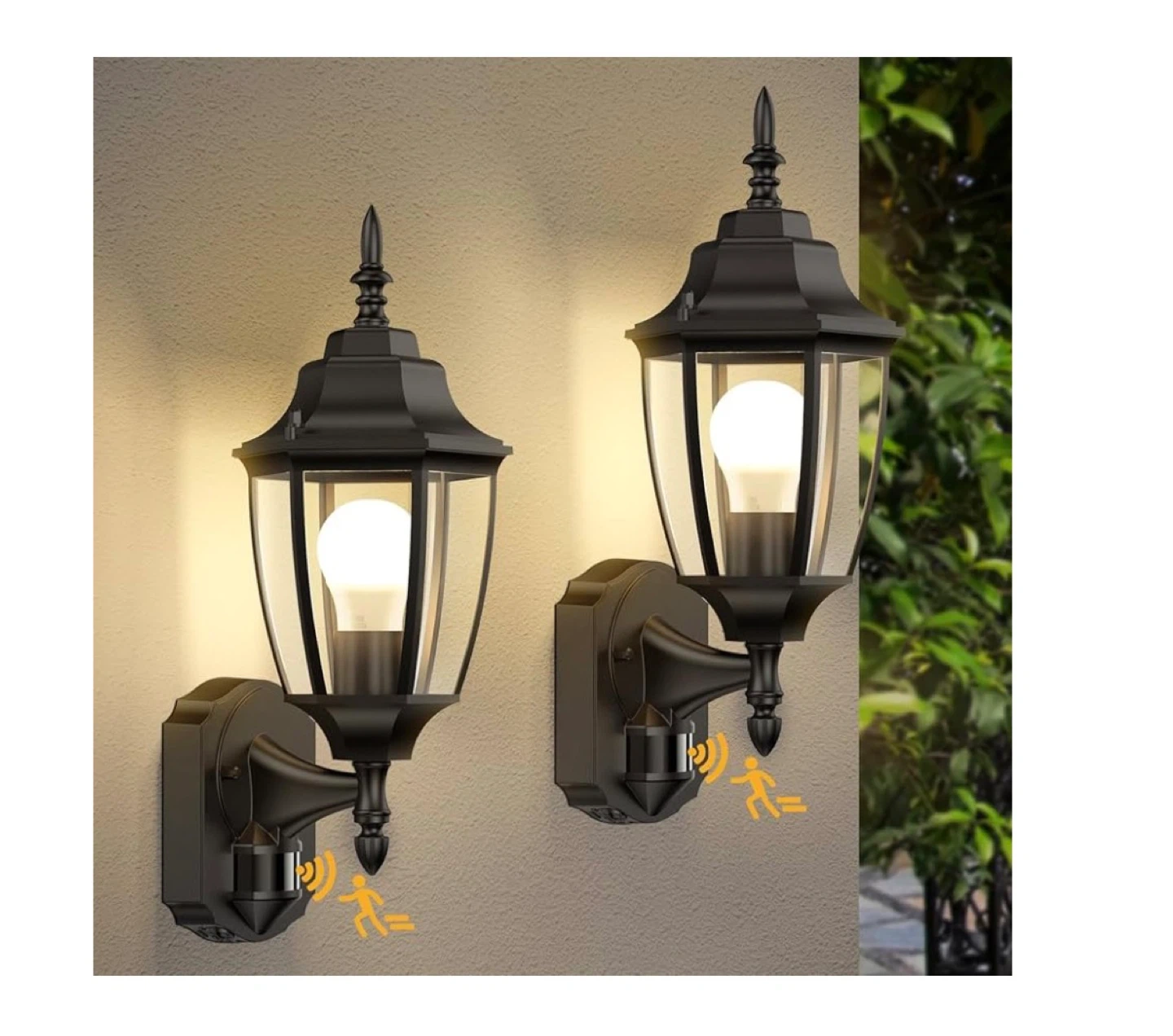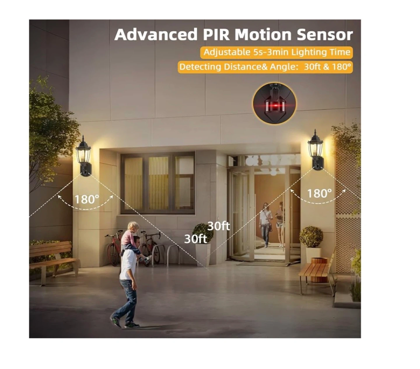 2 pack This outdoor wall light has an advanced PIR motion sensor with adjustable lighting time. It can detect motion at a distance and angle of 30ft and 180°. It features 3 lighting modes: automatically turn off at day, PC mode (dusk to dawn sensor), and automatically turn on at night. It's also waterproof, sunproof, snowproof, and windproof