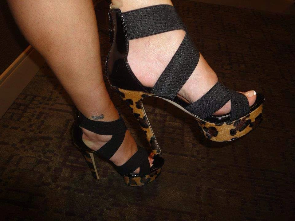 These platform heels feature black straps and a fun leopard print design on the platform and heel. They're perfect for adding a bit of flair to your outfit! Purchased in Las Vegas