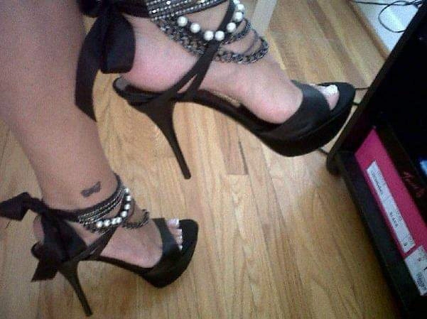 These black heels feature a stylish ankle detail with pearls and chains, and a ribbon tie. They're perfect for dressing up any outfit! Purchased in Miami