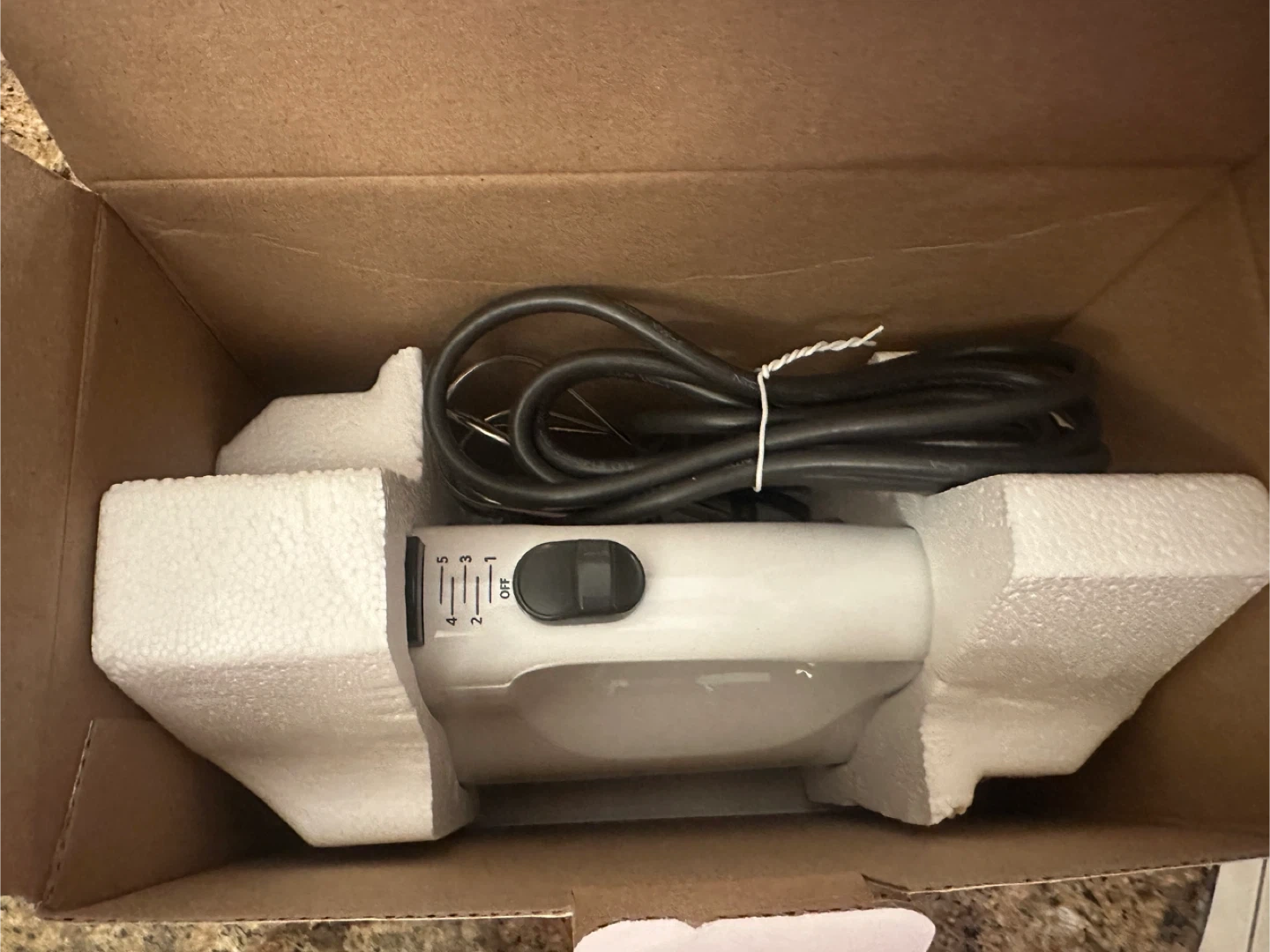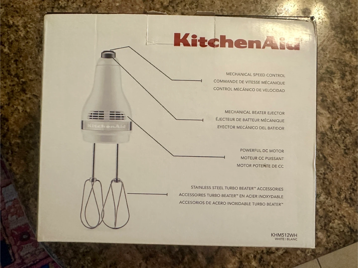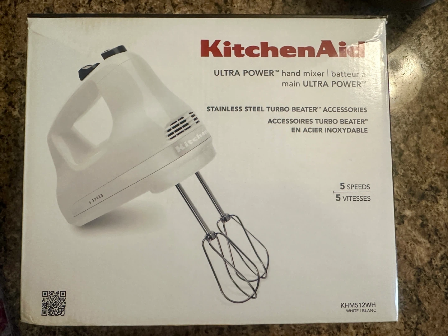 This is a brand new KitchenAid Ultra Power hand mixer, model KHM512WH, with 5 speeds and stainless steel turbo beater accessories. It's in its original box, unused and ready to help you with all your mixing needs! Here are some features: * 5 Speeds * Turbo Beater Accessories * Mechanical Speed Control * Mechanical Beater Ejector * Powerful DC Motor