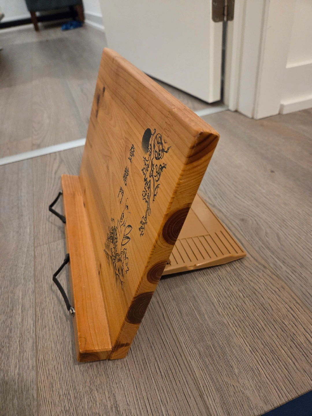 Here's a lovely wooden book stand! It features a unique dragon design. Perfect for holding your favourite books or cookbooks while adding a touch of character to your space