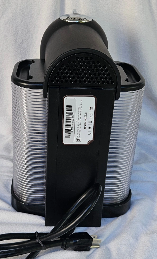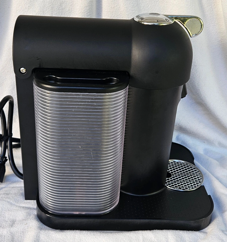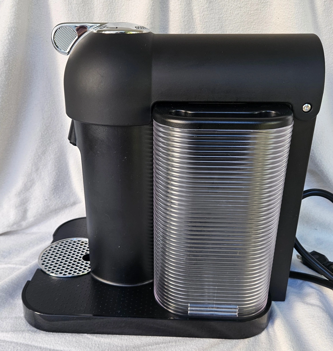 Nespresso Vertuo Coffee and Espresso Machine by Breville Matte Black This Nespresso Vertuo Coffee and Espresso Machine are in excellent working and cosmetic cond. All electrical and mechanical features are in excellent working order. The water flow is consistent and the machine makes a perfect cup every time. The exterior is in excellent cond. There are no scratches, dents, chips or missing pieces of any kind. All attachments are accounted for and are in excellent cond. For testing, please bring a Nespresso Vertuo coffee pod , unfortunately I have ran out. Highlights: Capacity400 ml Programmable Coffee Maker Type Espresso Machine Operation Mode Fully Automatic Wattage 1350 watts Voltage 110 Volts