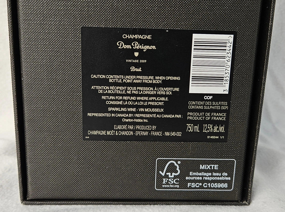 Dom Perignon Champagne Vintage 2009 750ml Box Only This box of a 750ml bottle, of Dom Perignon Champagne Vintage 2009 is in excellent display cond. This Dom Perignon Champagne 750ml bottle would make a great display for your bar, office kitchen etc.