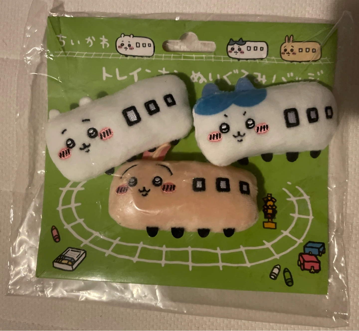 Selling a super cute Chiikawa Train Plush Badge set! It includes three adorable plush trains featuring Chiikawa characters. This set is brand new and still sealed in its original packaging. Originally bought for $19.99!