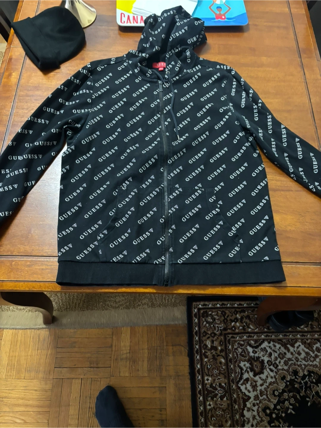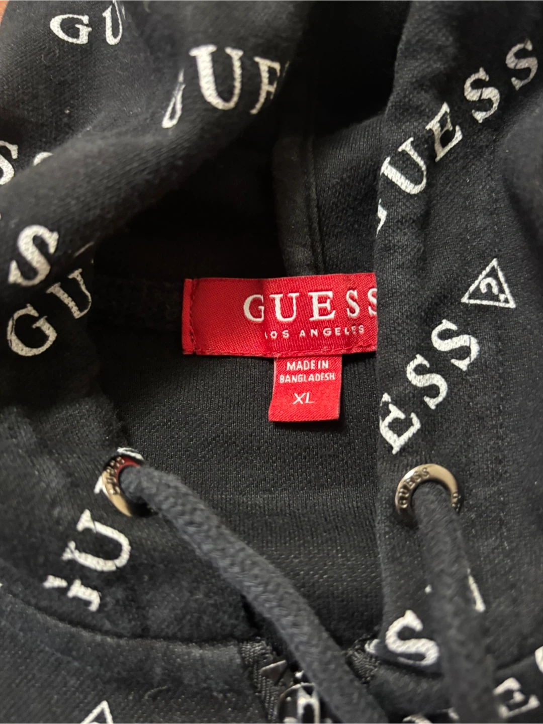 Selling a Guess hoodie with an all-over print in black. It's a size XL and is in great condition. The hoodie features a full zip and a drawstring hood. Perfect for adding a stylish layer to your outfit!