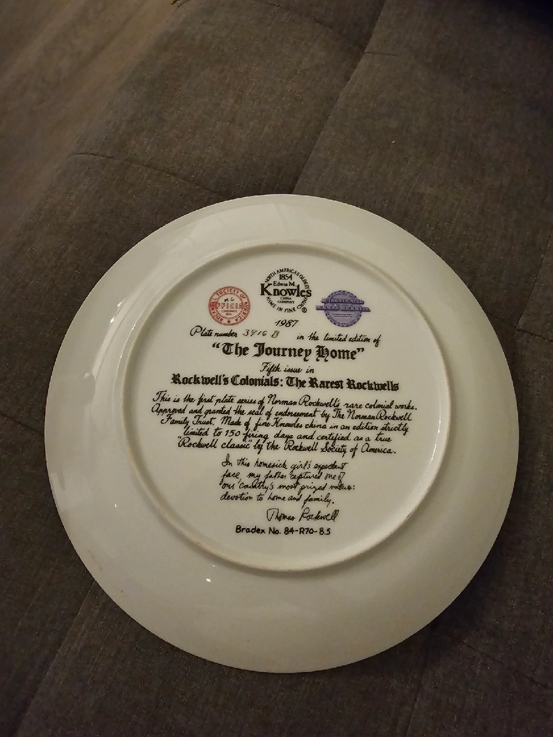 Selling a Rockwell's "The Journey Home" collector plate. It's the fifth issue in Rockwell's Colonials: The Rarest Rockwells series. This plate is the first plate series of Norman Rockwell's rare colonial works. It's approved and graded under the recommendation of the Knowles China in an edition strictly limited to 150 firing days and certified as a true Rockwell classic of the Rockwell Society of America. The Bradex number is 84-R70-8.5