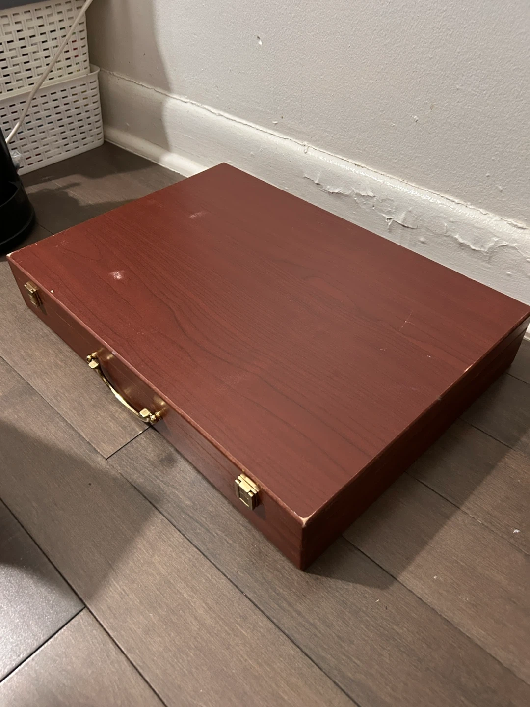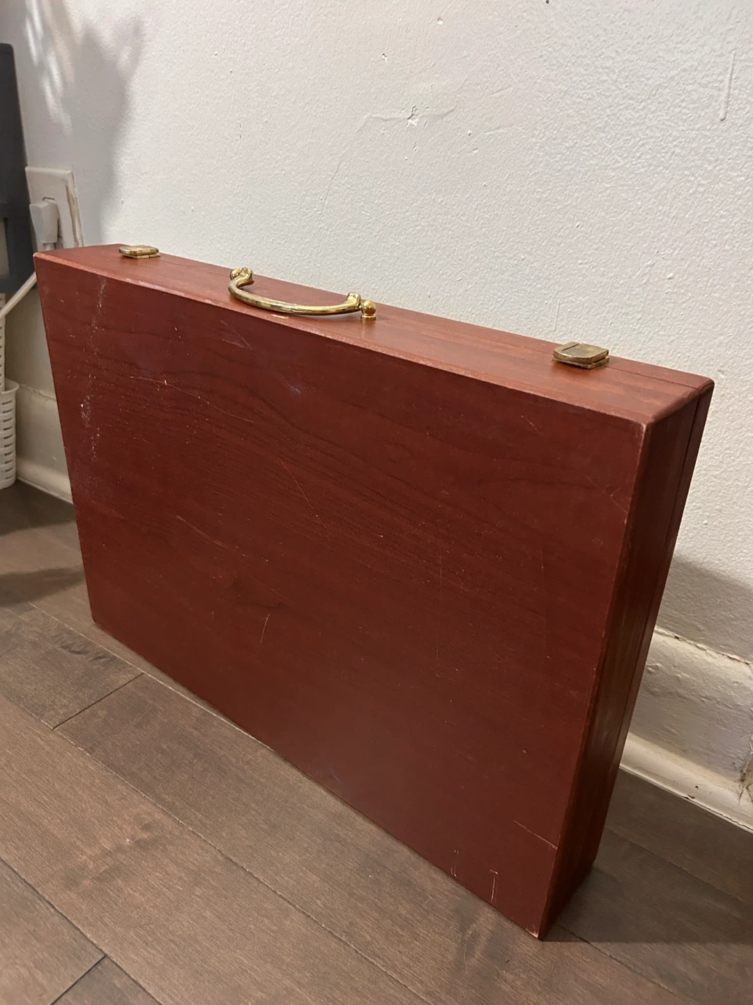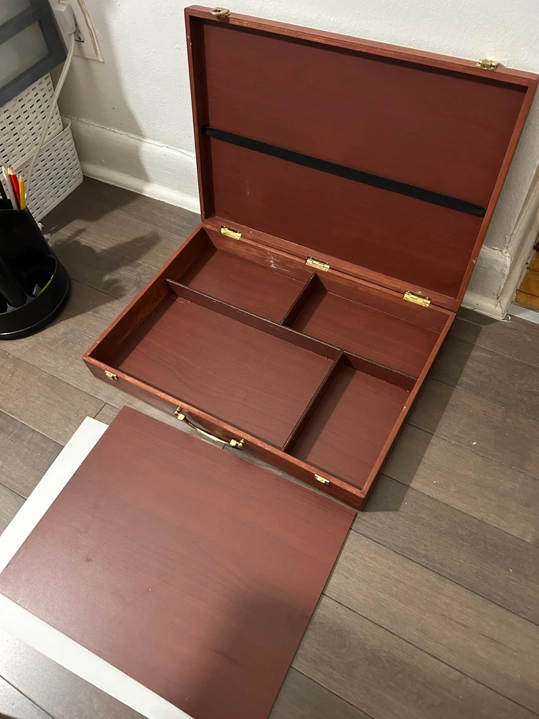 Selling a wooden art supply storage box. It's in great condition and ready for a new home! It has a handle and compartments inside for organizing your art supplies. Perfect for artists or anyone who loves to keep their supplies organized