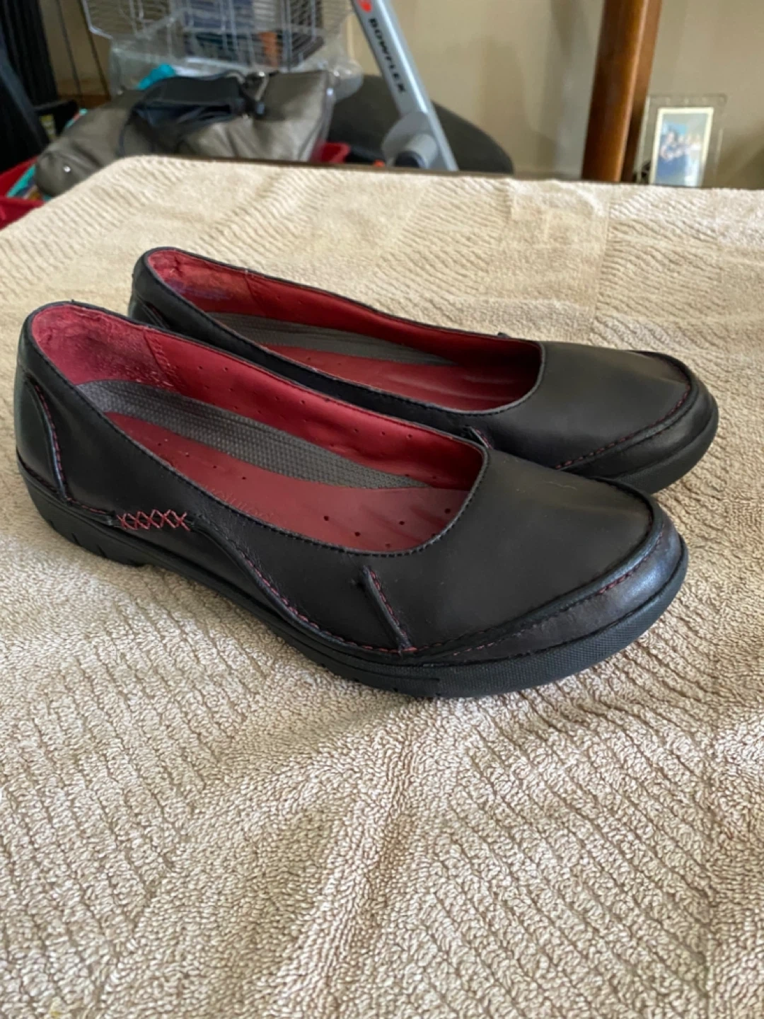 These are a pair of Clarks Structured black leather flats in a women's size 5. They have a red interior and red stitching detail. The soles feature a unique floral and bird pattern. They are in excellent condition and ready for a new home!