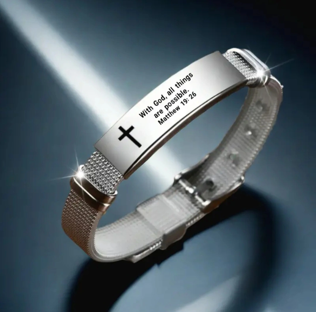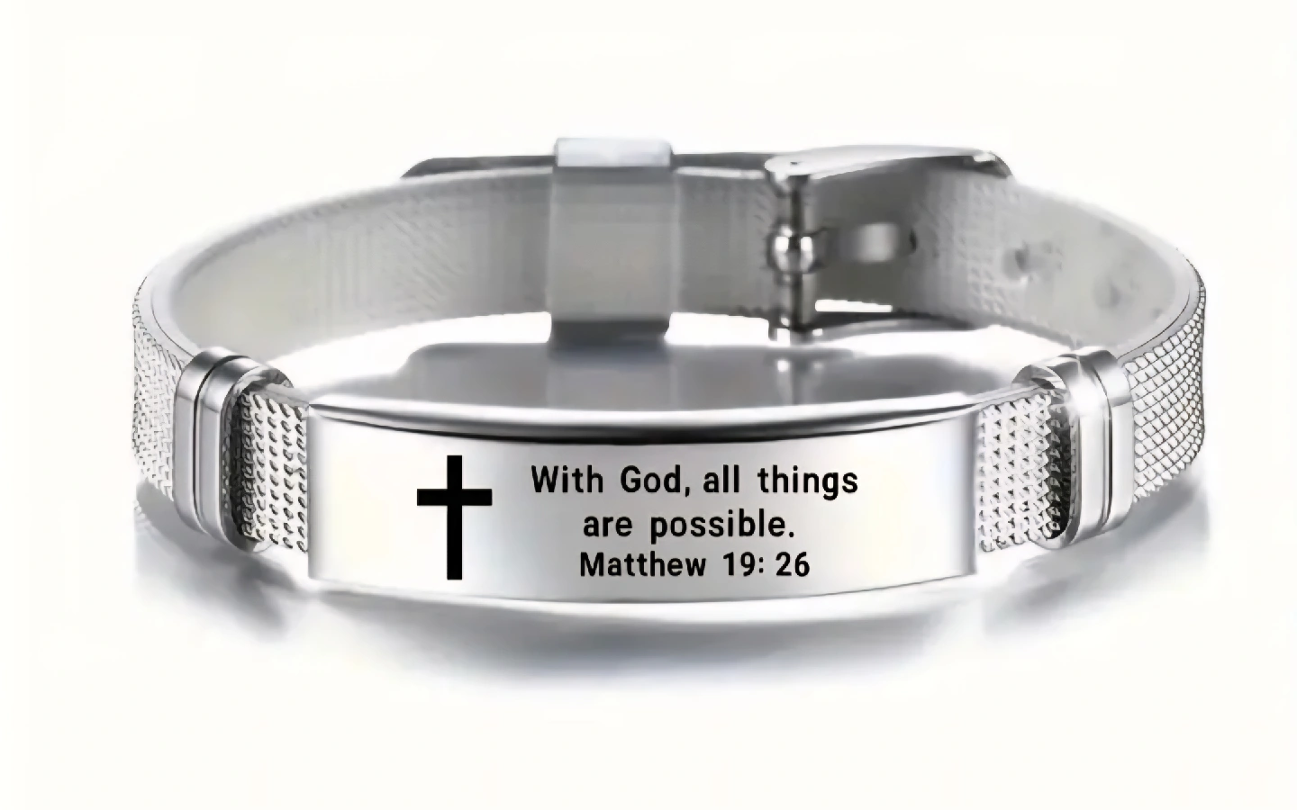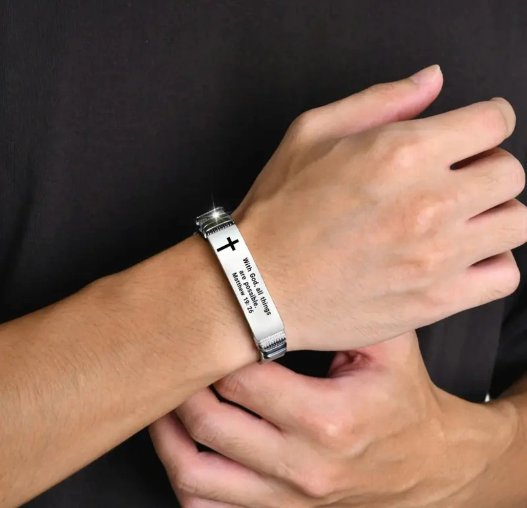 This is a silver bracelet with a cross symbol and the bible verse Matthew 19:26 engraved on it: "With God, all things are possible"