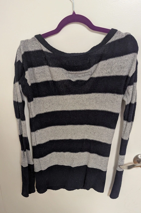 Selling a Hollister sweater in a striped pattern of grey and navy! It's a size medium and in great condition. Perfect for layering or wearing on its own!