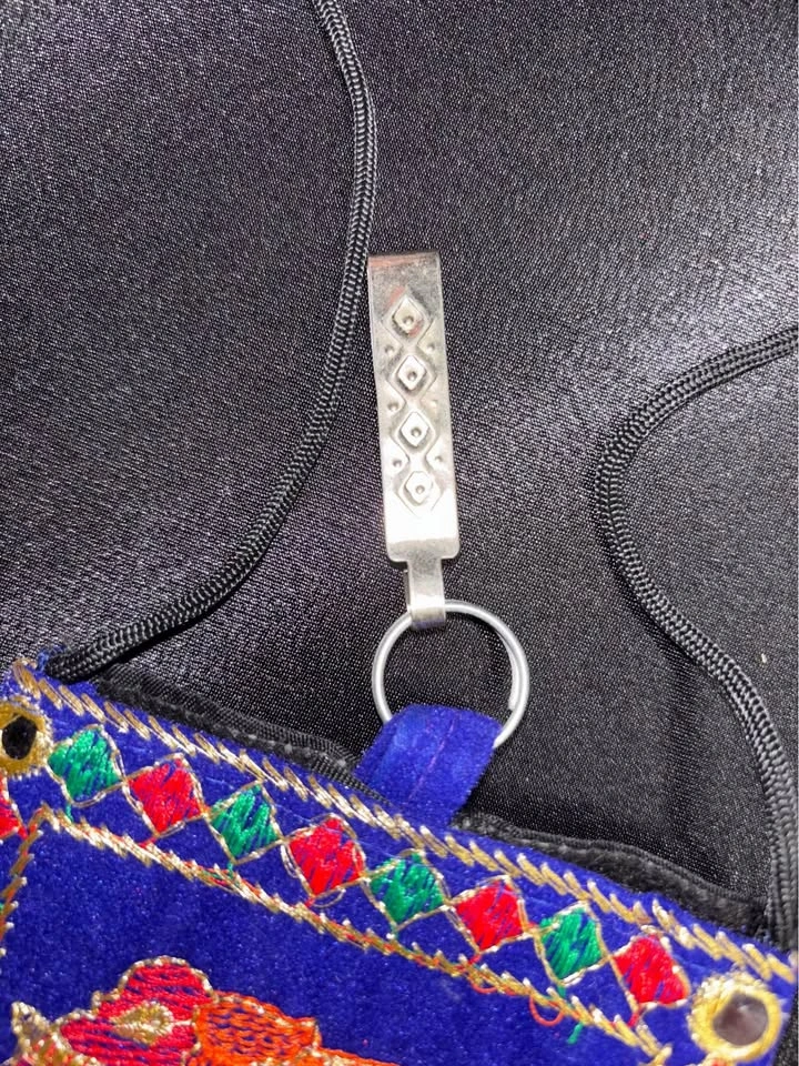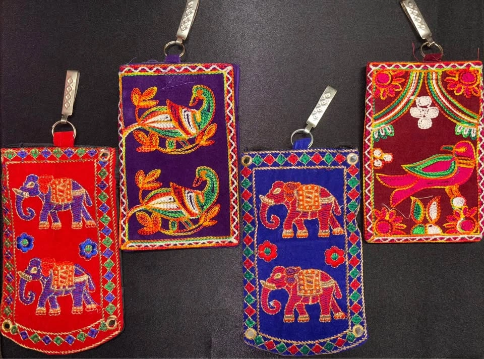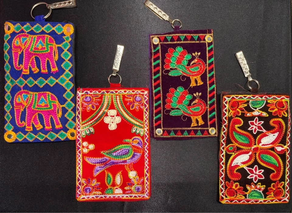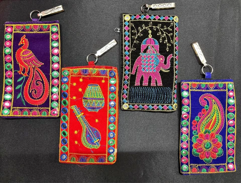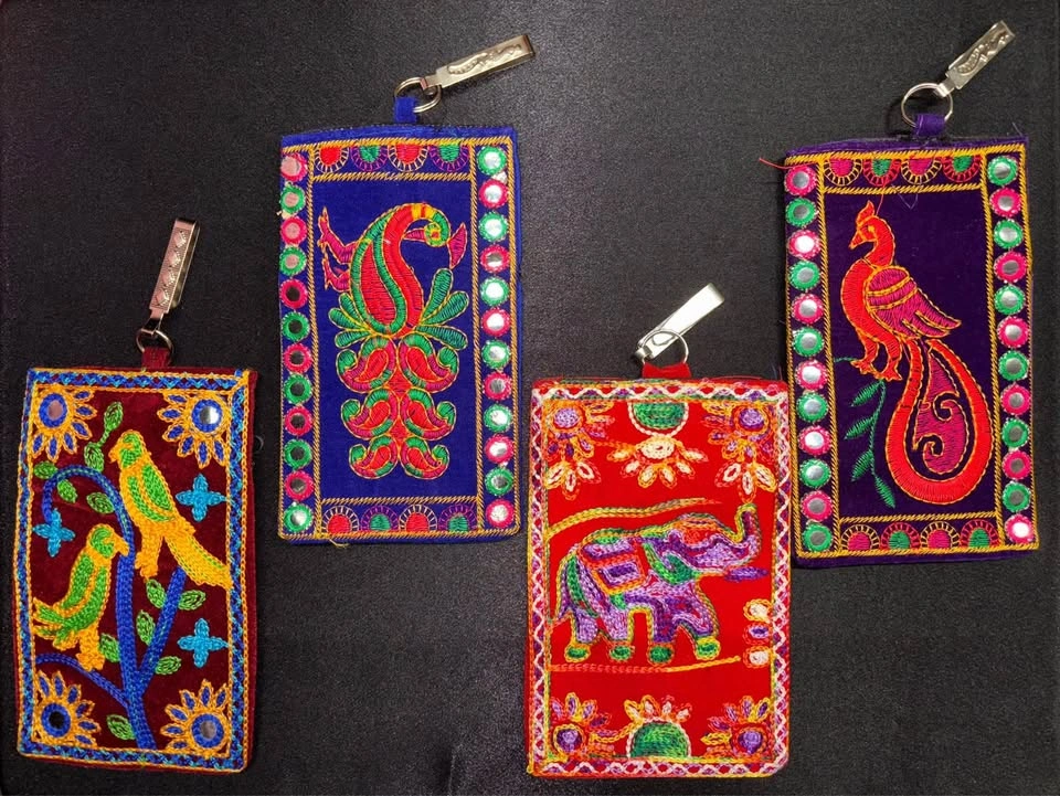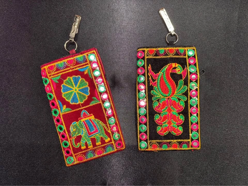 Gorgeous embroidered pouches, perfect accessory for any event! Velcro enclosure on main pocket Has hook to fit onto waistband Comes with strap to wear on shoulder Additional zipper pocket on back Fits a cellphone, ++ Small essentials Beautiful to give as a gift! 7x4 inches $10 each