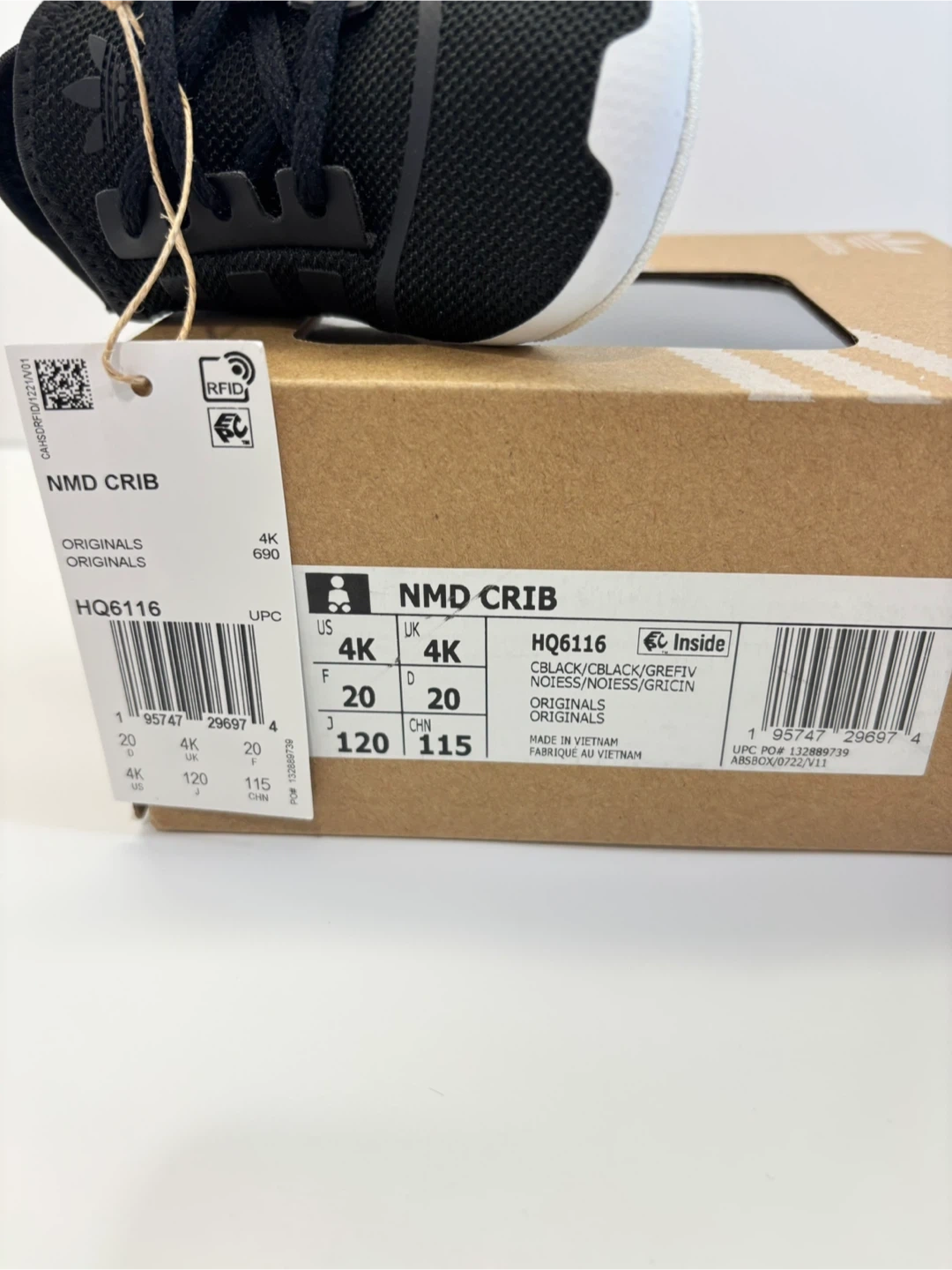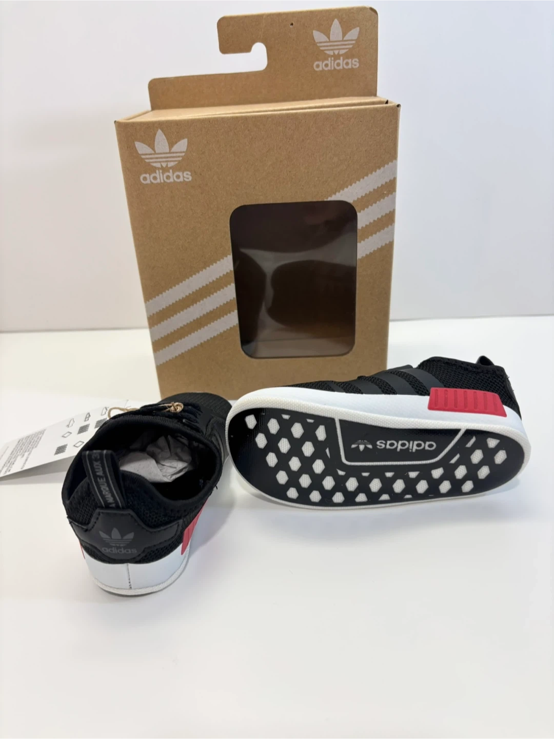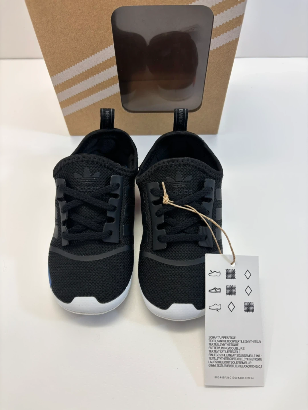 Clean and brand New ! no pet/smk Adidas NMD Crib Slip on Sneakers infant baby shoes in size US 4K. These adorable shoes come in their original box, perfect for a little one! The colour is black/black/grefiv. Size 4K is roughly size 12-15 months