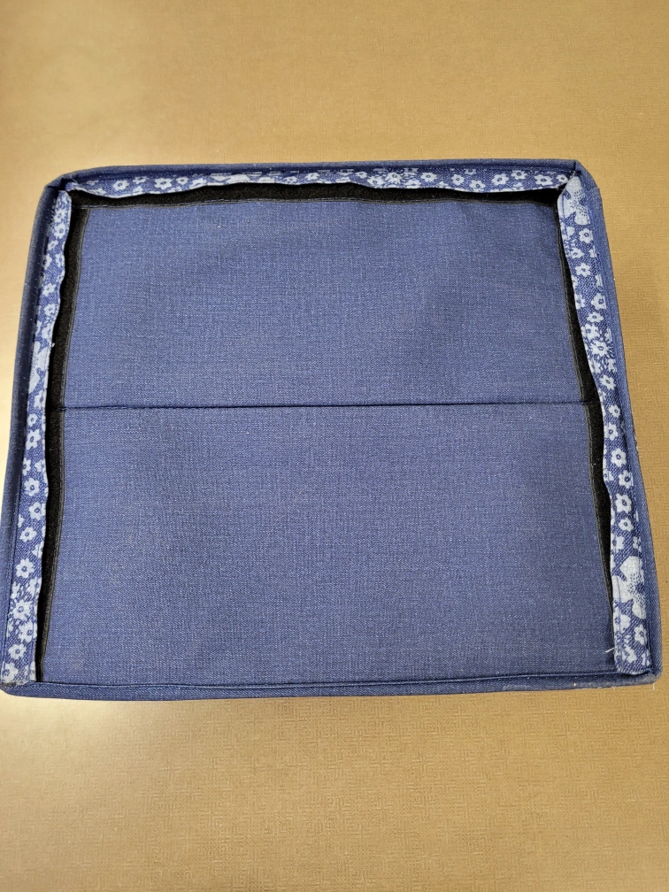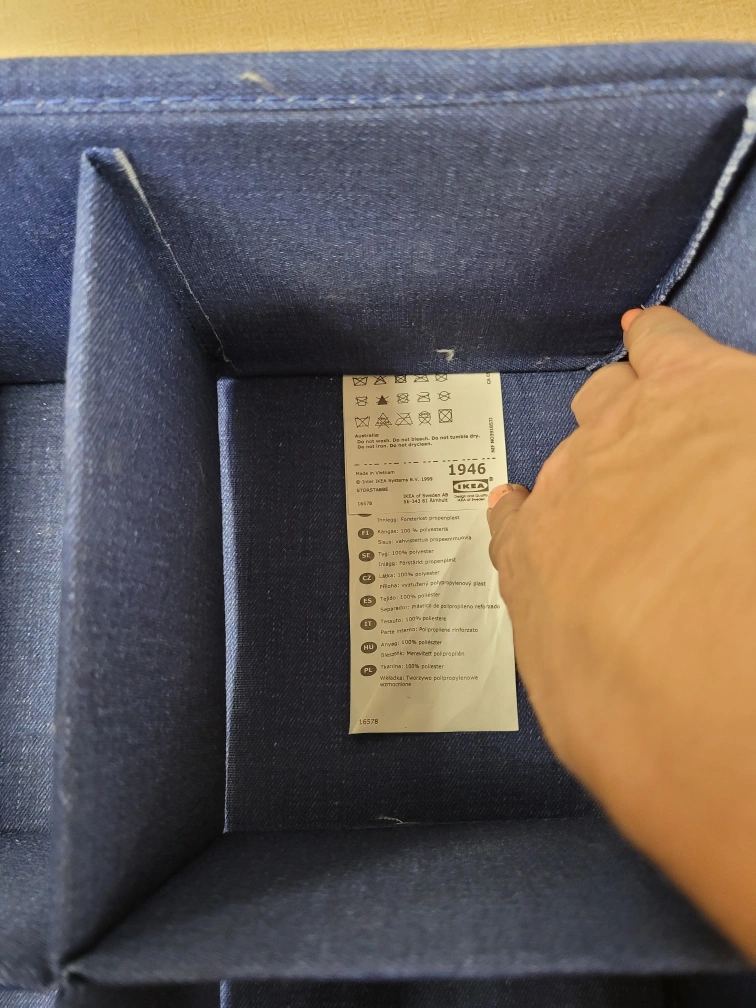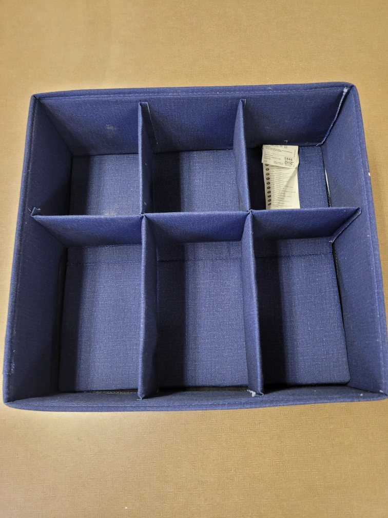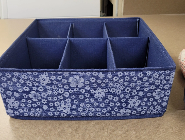 This is a cute 6-compartment storage box from IKEA. It's perfect for organizing small items in your closet or on a shelf. The box is blue and has a floral pattern around the edges. The material is 100% polyester