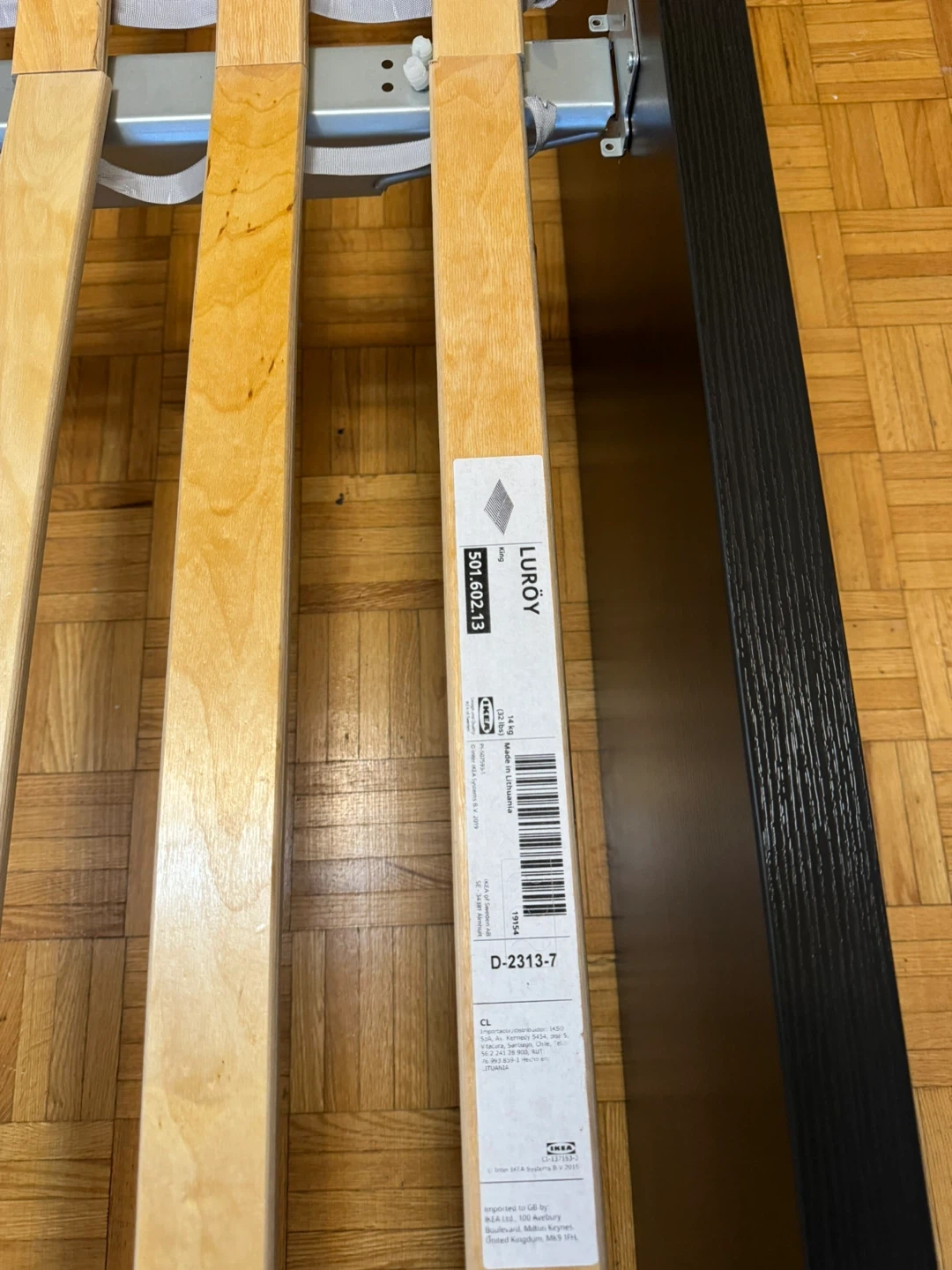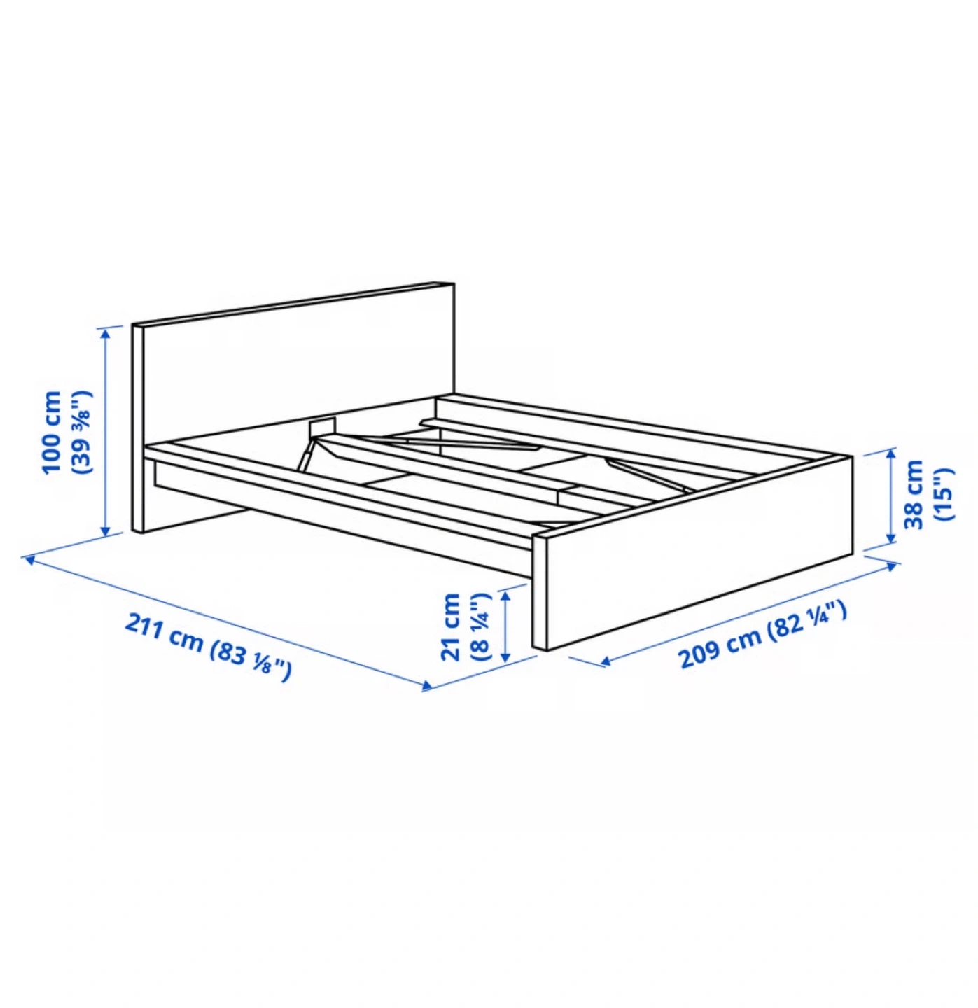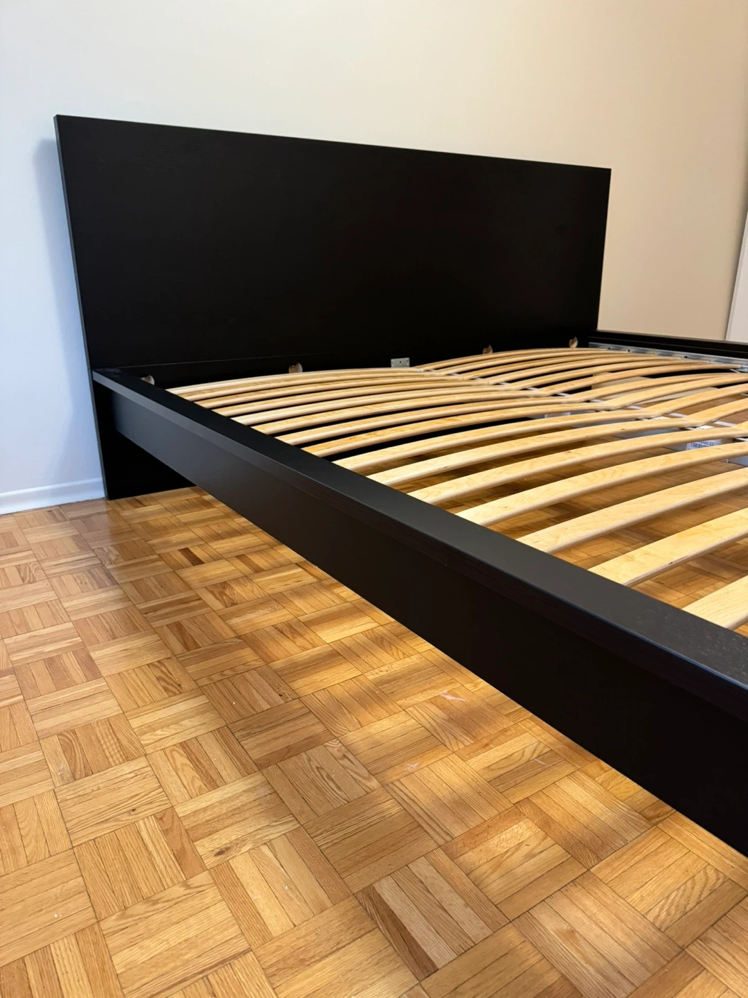 PICK UP ONLY See photo slides for dimensions. Item is AVAILABLE if not marked sold! Selling a black IKEA Malm bed frame in King size (slat included ). It's in great shape and ready for a new home. Dimensions are approximately 211 cm (83 1/8") in length and 209 cm (82 1/4") in width. Perfect for adding a modern touch to your bedroom!