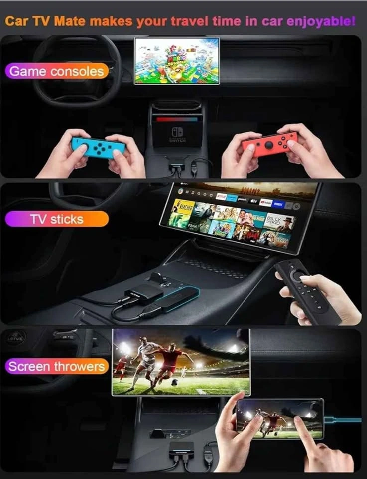 Brand new and sealed. Amazon price is $65, selling for $30. This is the only Carplay adapter with HDMI port that you can use to play your games, watch TV and play YouTube videos. đăCar TV Mate ProăThis car mate tv features dual channels for factory wired CarPlay and HDMI multimedia. With the car streaming device, you can easily enjoy your favorite media via HDMI, connecting devices such as gaming consoles, Fire TV Stick and Google TV Stick directly to your in-car screen. đăHigh Performance Car TV MateăHDMI multimedia & wireless carplay adapter comes with an HDMI input port for connecting devices with available HDMI output. Supports up to 2K 60Hz resolution. The YouTube tv adapter delivers clean and crisp image quality with no frame lag. đăWireless CarPlay AdapterăThe CarPlay Wireless Adapter seamlessly turns your CarPlay from wired to wireless! The car play tv adapter also supports voice control, steering wheel control, touch screen control and knob operation. You can use siri to assist with driving, such as listening to music, navigating and reading text messages. â¨ăPlug and Play & Easy to CarryăCar tv mate - hdmi multimedia & wireless carplay adapter plug-and-play design makes it easy to use - simply connect the car video adapter to your car, then connect your device via the HDMI port and enjoy your media. Compact and powerful. đăStrong CompatibilityăCar TV Mate is compatible with most TV Sticks (e.g. Fire TV, Apple TV, Google TV, Roku TV), game consoles (e.g. PS4, PS5, Nintendo Switch), screen throwers and other devices. Compatible with over 800 models equipped with factory wired CarPlay, supports iOS 10 and higher phones. Comes with USBC-C and USBC-A cables for perfect compatibility with USB and USB-C car ports. â¨ăSupport Phone MirroringăThis Car TV Mate HDMI multimedia adapter supports cell phone mirroring function, allowing you to watch your favorite videos on the go. In addition, it can also turn your car into a game center, bringing endless fun to your passengers.