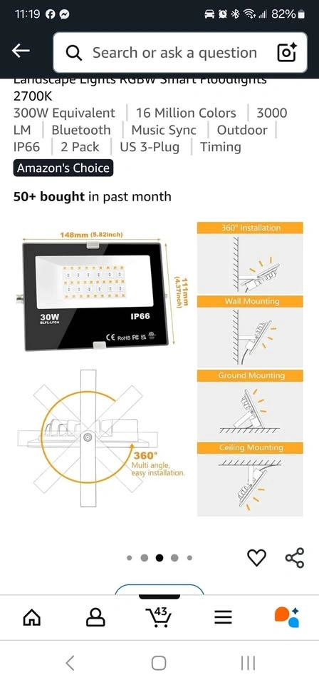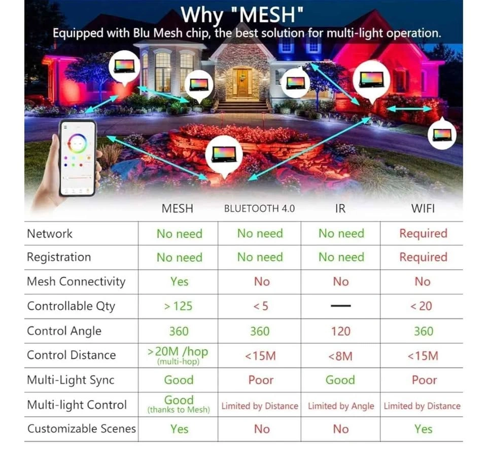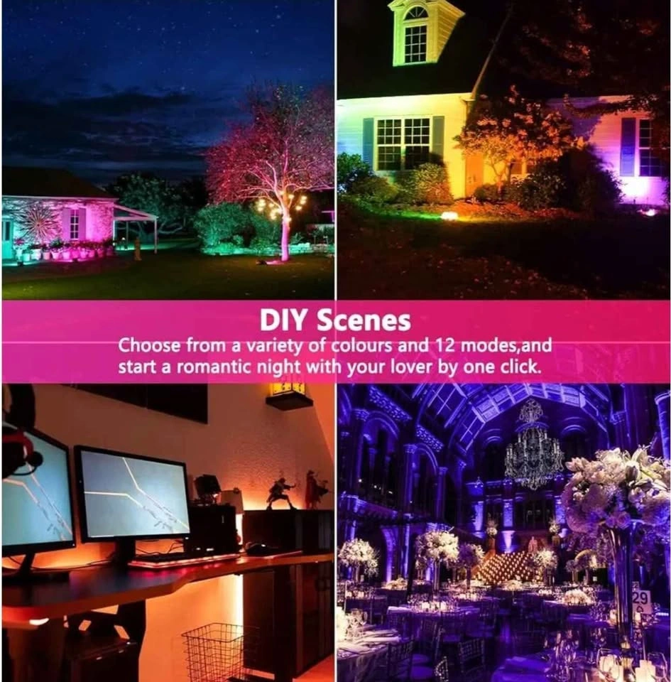 New in box. One piece of flood light only. This is a 30W RGB color changing led flood light needed APP Control. It's 30W, super bright 2700K warm white, Equivalent 300W, 3000 lumens, CRI > 85. This led outdoor up lights have 16 million colors and 23 modes, include ''DIY Flash'' and '' DIY fade'' mode, music rhythm and timing function. IP66 rated waterproof, suitable for both indoor/outdoor uplights, stage lighting, landscape lighting. No registration nor internet required. Scan the QR code on the manual to download the APP,Then enter the app to add the lights. Equipped with Bluetooth 5.0 chip, Mesh function enabled. Practical user interface allows free control to any number of floodlights as desired. An excellent solution to multi-light operation, which overcomes the shortcomings of remote control lights and WIFI lights. Built-in newly developed timing chip allows you to set your favorite color or mode to automatically turn on and off on time every day. And when we use the (strobe, smooth, flash) modes, the rhythm of the color change of the floodlight can be kept consistent. Our Smart led flood light can change colors according to rhythm of music melody. You can choose dynamic or soft music according to your preferences. We have 16 million colors and 12 modes, so it can used for stage lights, led up lights, landscape lighting, backdrop lighting, outdoor strobe light, spot light. and you can use it to decorate your Christmas, Halloween, weddings, garden and so on You can set the color or mode for each lamp individually, then match it to your favorite scenes (such as party, BBQ, garden, garage, tree lights, up lighting for weeding, Halloween outdoor lights, Christmas lights,Valentine's Day decoration and other festival decoration,etc), save it and activate it with one click at any time. White flash very suitable for Halloween decoration, can imitate the effect of lightning, and you can adjust the speed to get any effect you want.