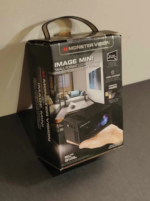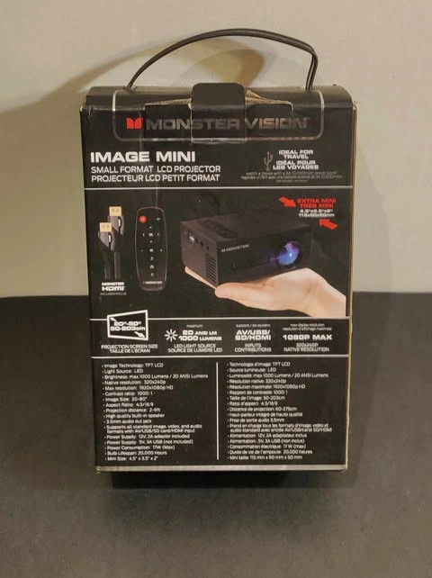 Elevate your home entertainment setup with the Monster Vision Image Mini Projector! Its compact design and powerful features make it the perfect choice for movie nights, gaming, or presentations. Key Features: 1000 Lumens for bright and vivid visuals Supports up to 1080p resolution for stunning clarity Multiple connectivity options: HDMI, USB, and AV inputs Easy-to-use remote control included Lightweight and portable for ultimate convenience Condition: New For more information or pickup details, feel free to message me directly here or contact me at 289 788 8085.