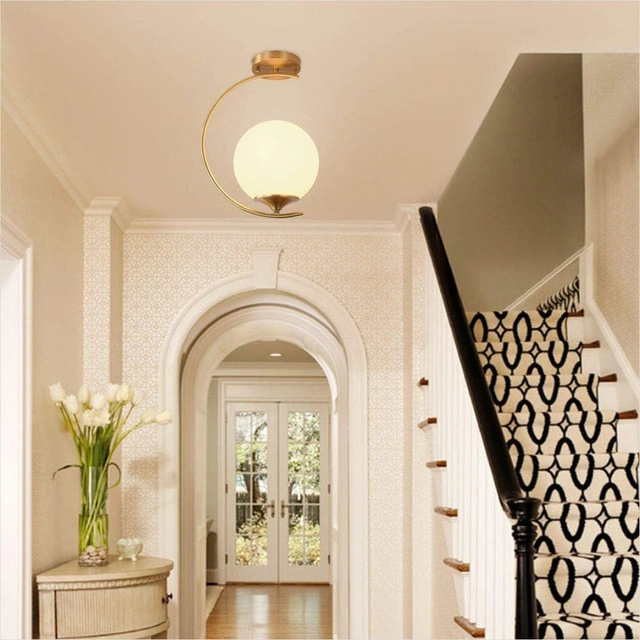 Elevate your space with this moon-inspired globe ceiling light by KCO. Featuring a sleek brushed gold finish and smooth white glass shade, this mid-century modern fixture adds charm and elegance to any room with low ceilings. Key Features: Dimensions: 13.2" H × 9.3" W (33.5 cm × 23.6 cm), Globe Diameter: 5.9" ⚡ E26 bulb base, supports 110–240V, dimmable with compatible bulbs & switch Chic semi-flush design ideal for low ceilings Brushed gold frame with soft white glass globe – simple yet stylish Perfect for dining rooms, bedrooms, hallways, foyers, or even cafes & boutiques Condition: New. For more information or pickup details, feel free to message directly or contact at 289 788 8085.