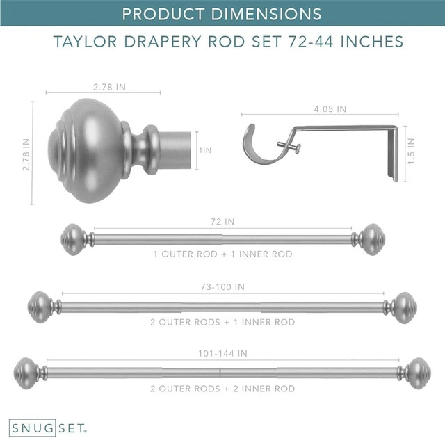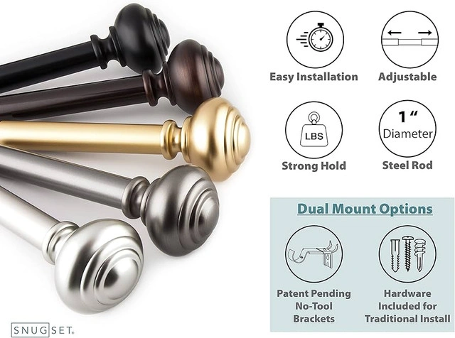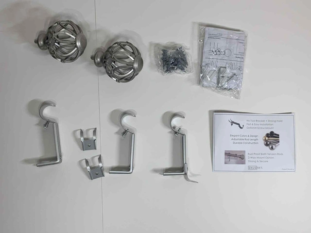 Add a modern touch to your space with the SnugSet Aiden Drapery Rod Set in a clean Aged Nickel finish. Designed for style and strength, this adjustable rod installs in minutes with no tools required. Condition: New – Open Box Manufacturer: SnugSet Size: Adjustable 36"–72" (91–183 cm) Diameter: 1 inch Finish: Aged Nickel (Pewter tone) Details: • No-tool bracket system — fast and easy to mount • Optional screw-mount with anchors for solid walls • Durable steel rod supports heavier curtain panels • Elegant, adjustable design for a polished look • Strong-hold brackets — each holds up to 15 lbs • All mounting hardware + instructions included • Extra center bracket included to prevent sagging • Patent pending SnugSet tech ensures secure hold Ideal For: Bedrooms, living rooms, rentals, and design refreshes with zero hassle Contact: Message directly here or call/text 289-788-8085 with any questions — happy to help.